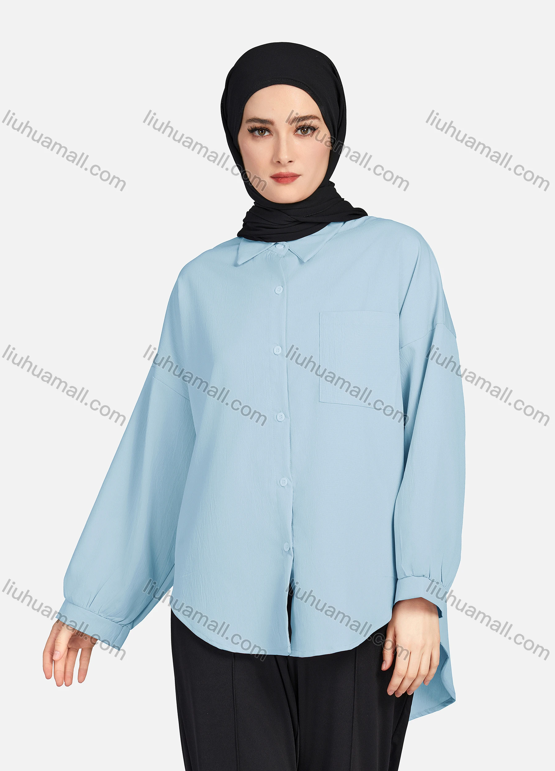 Wholesale Women's Casual Plain Collared Long Sleeve Curved Hem Pocket Button Down Top 1420#