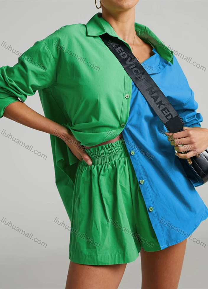 Wholesale Women's Casual Plain & Colorblock Long Sleeve Shirts & Elastic High Waist Shorts 2 Piece Set