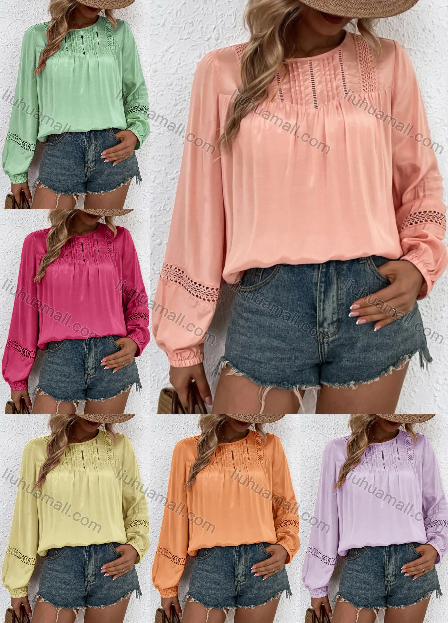 Wholesale Women's Casual Plain Round Neck Cut Out Long Sleeve Blouse