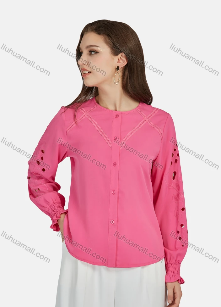 Wholesale Women's Casual Plain Round Neck Cut Out Long Sleeve Button Down Shirt N8787#