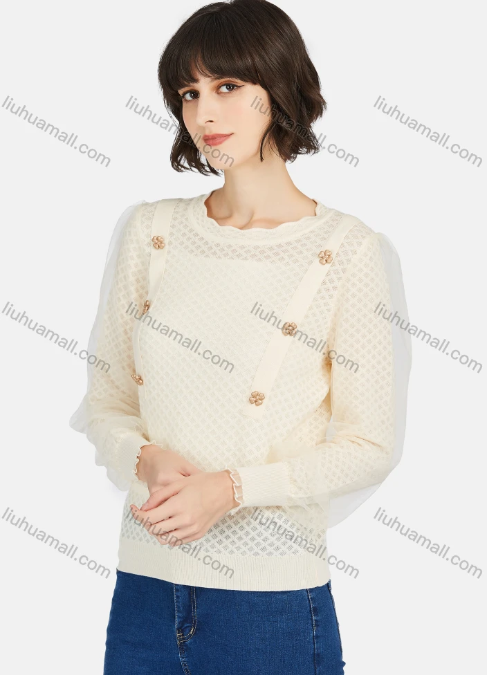 Wholesale Women's Casual Plain Ruffle Neck Clover Decor Mesh Long Sleeve Sweater