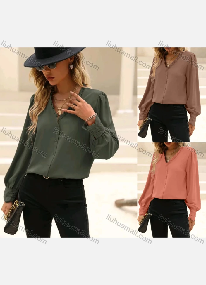 Wholesale Women's Casual Plain Ruffle Trim Button Down Long Sleeve Blouse