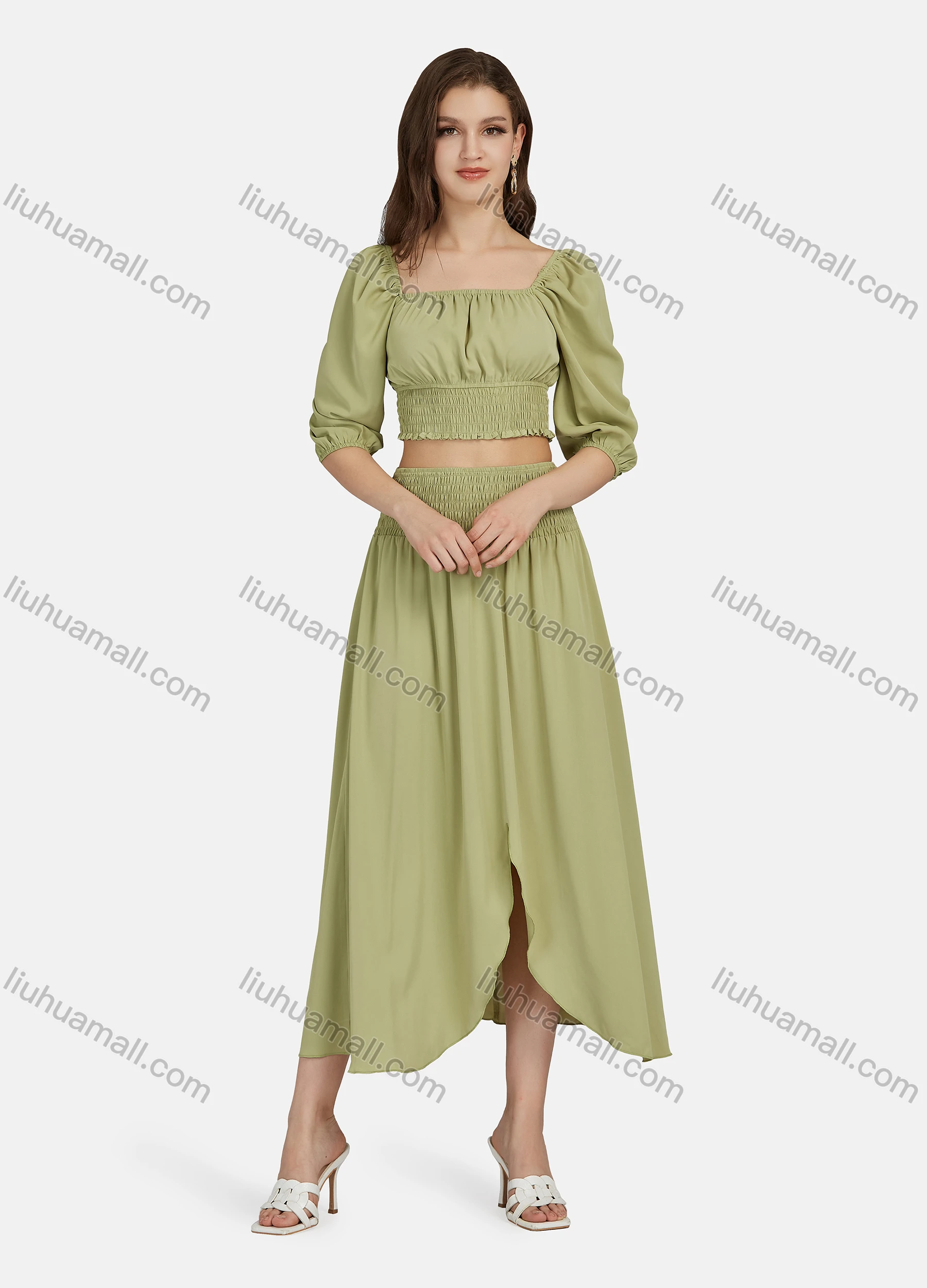 Wholesale Women's Casual Plain Shirred Square Neck Ruched Puff Sleeve & Shirred High Waist Split Hem Midi Dress 2 Piece Set N8500#
