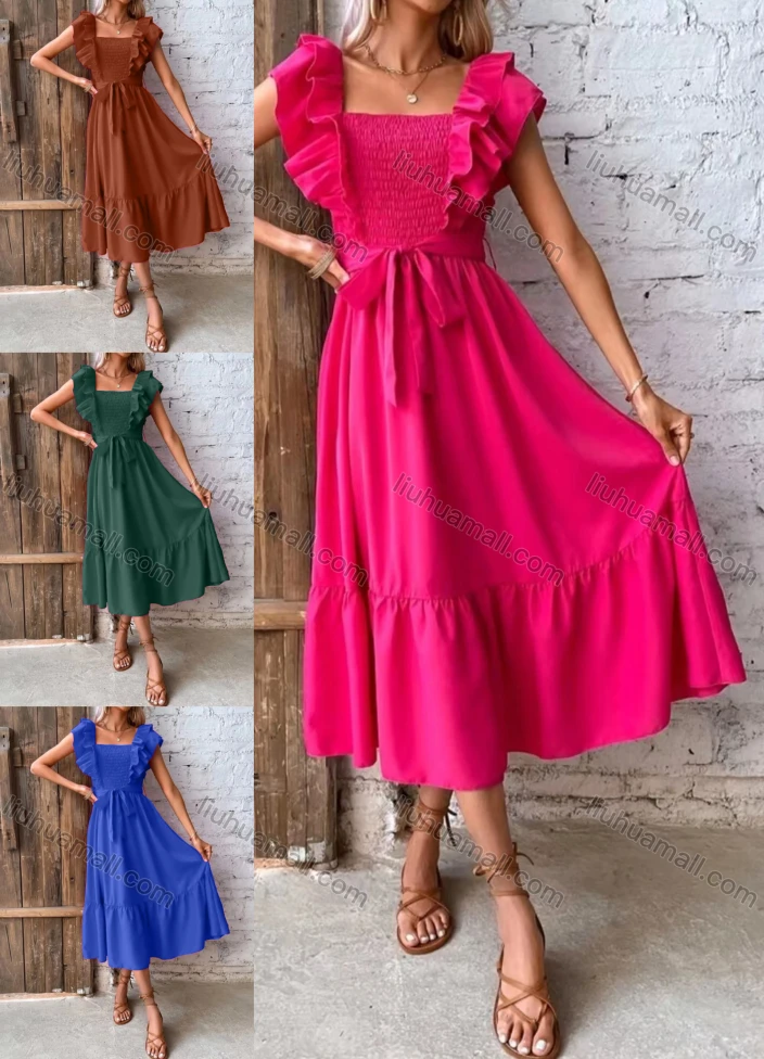 Wholesale Women's Casual Plain Square Neck Shirred Ruffle Trim Midi Dress With Belt
