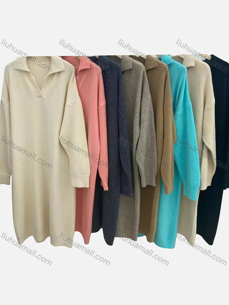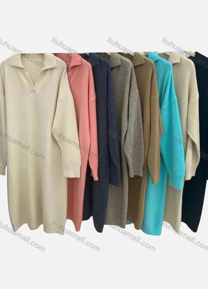Wholesale Women's Casual Plain Turn-down Collar Long Sleeve Midi Sweater Dress 809#