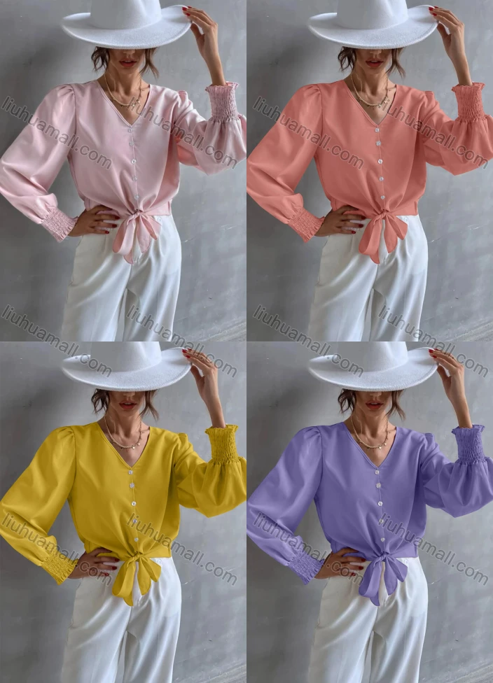 Wholesale Women's Casual Plain V Neck Button Down Long Sleeve Tie Front Blouse