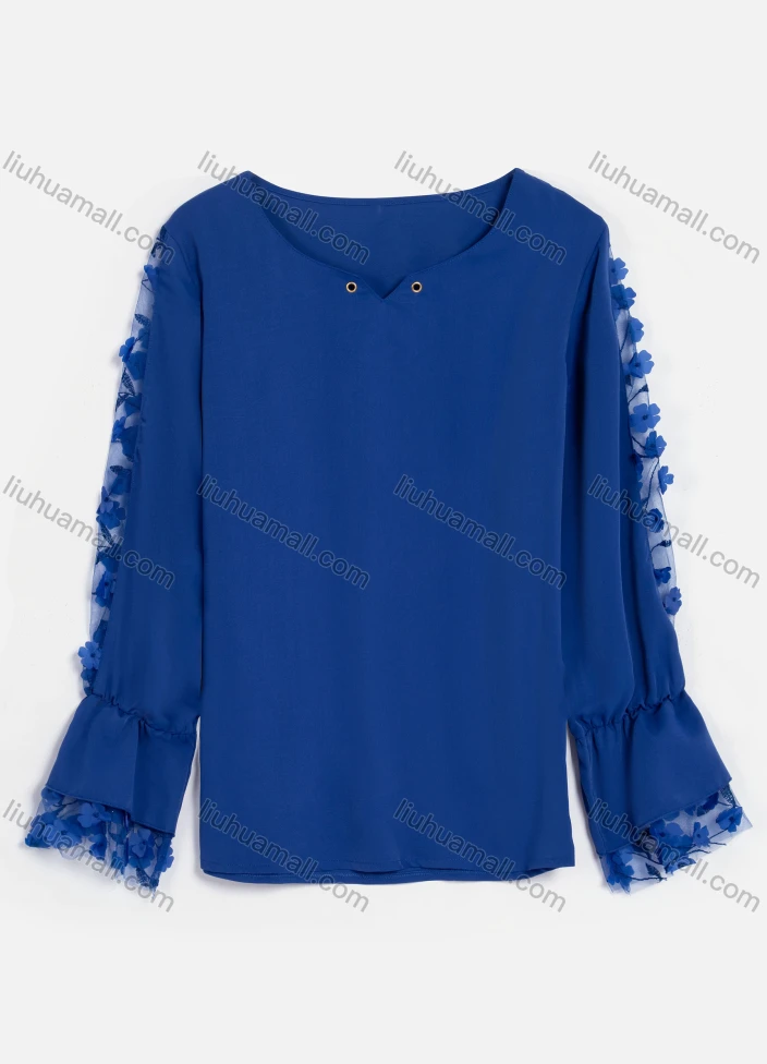 Wholesale Women's Casual Plain V Neck Mesh Splicing 3D Flower Appliques Long Sleeve Blouse C046#