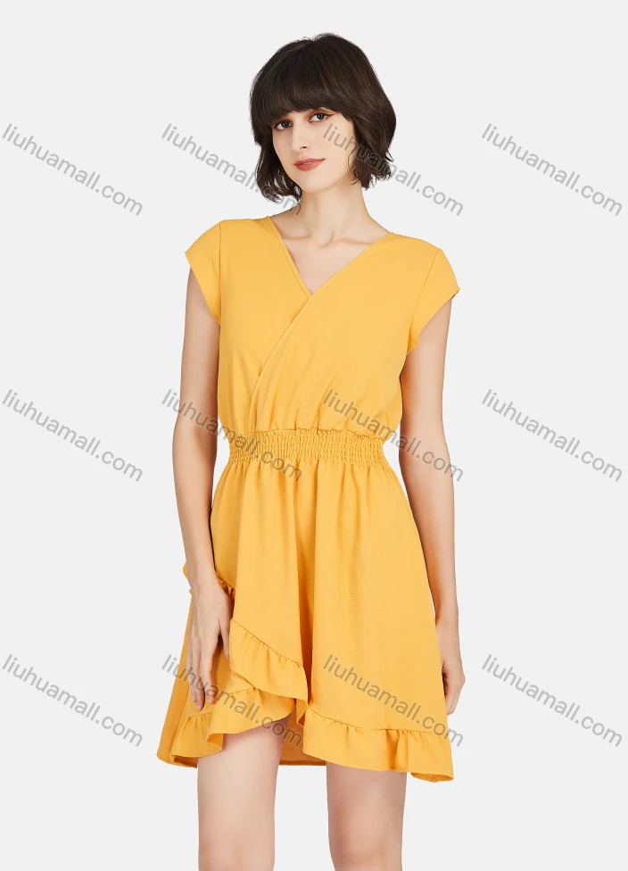 Wholesale Women's Casual Plain V Neck Ruffle Hem Wrap Dress