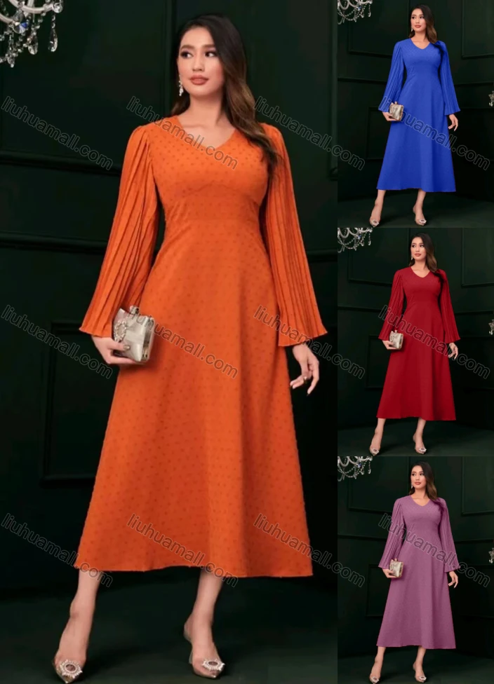 Wholesale Women's Casual Plain V Neck Swiss Dot Pleated Long Sleeve Maxi Dress