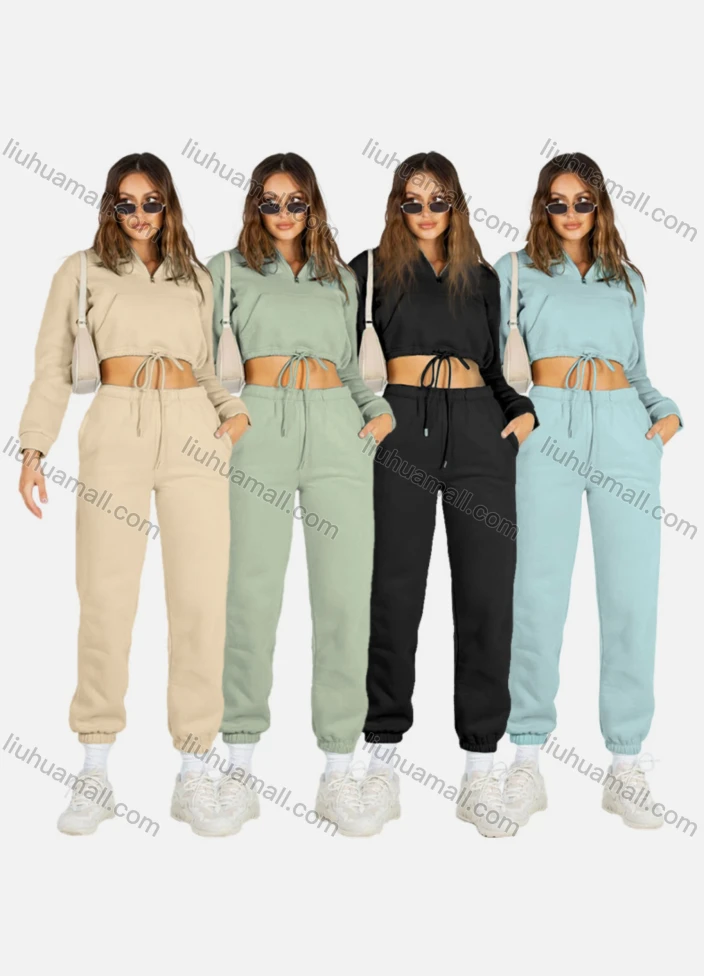 Wholesale Women's Casual Plain Zipper Drawstring Crop Plush Sweatshirt & High Waist Drawstring Pants 2 Piece Set 2021988#