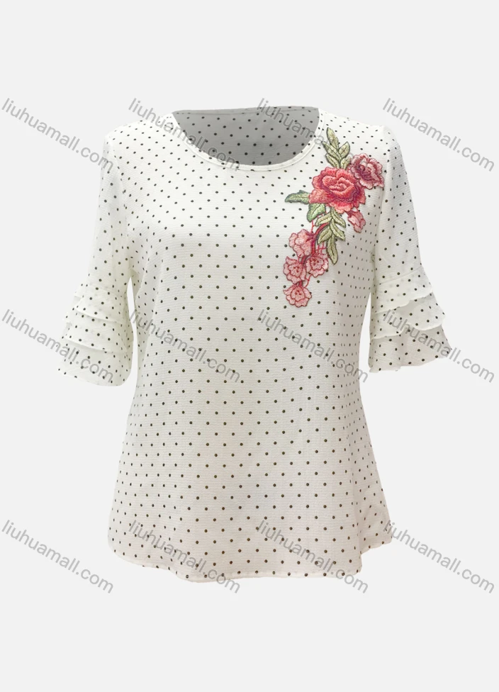 Wholesale Women's Casual Polka Dot Floral Embroidery Round Neck Layered Sleeve Blouse