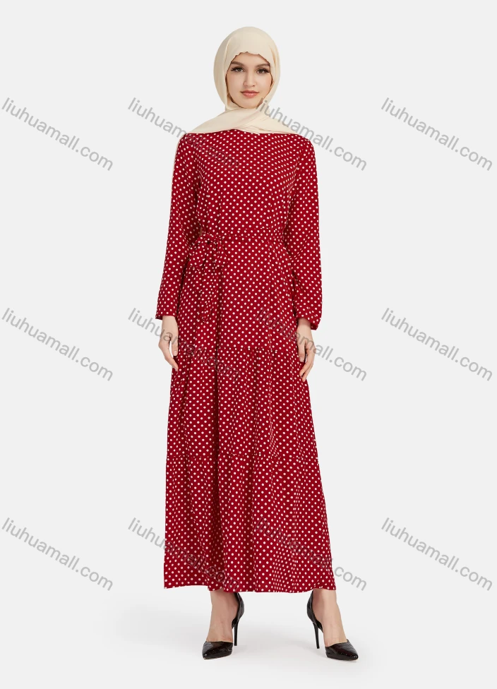 Wholesale Women's Casual Polka Dot Long Sleeve Ruffle Hem Maxi Dress With Belt 1344#