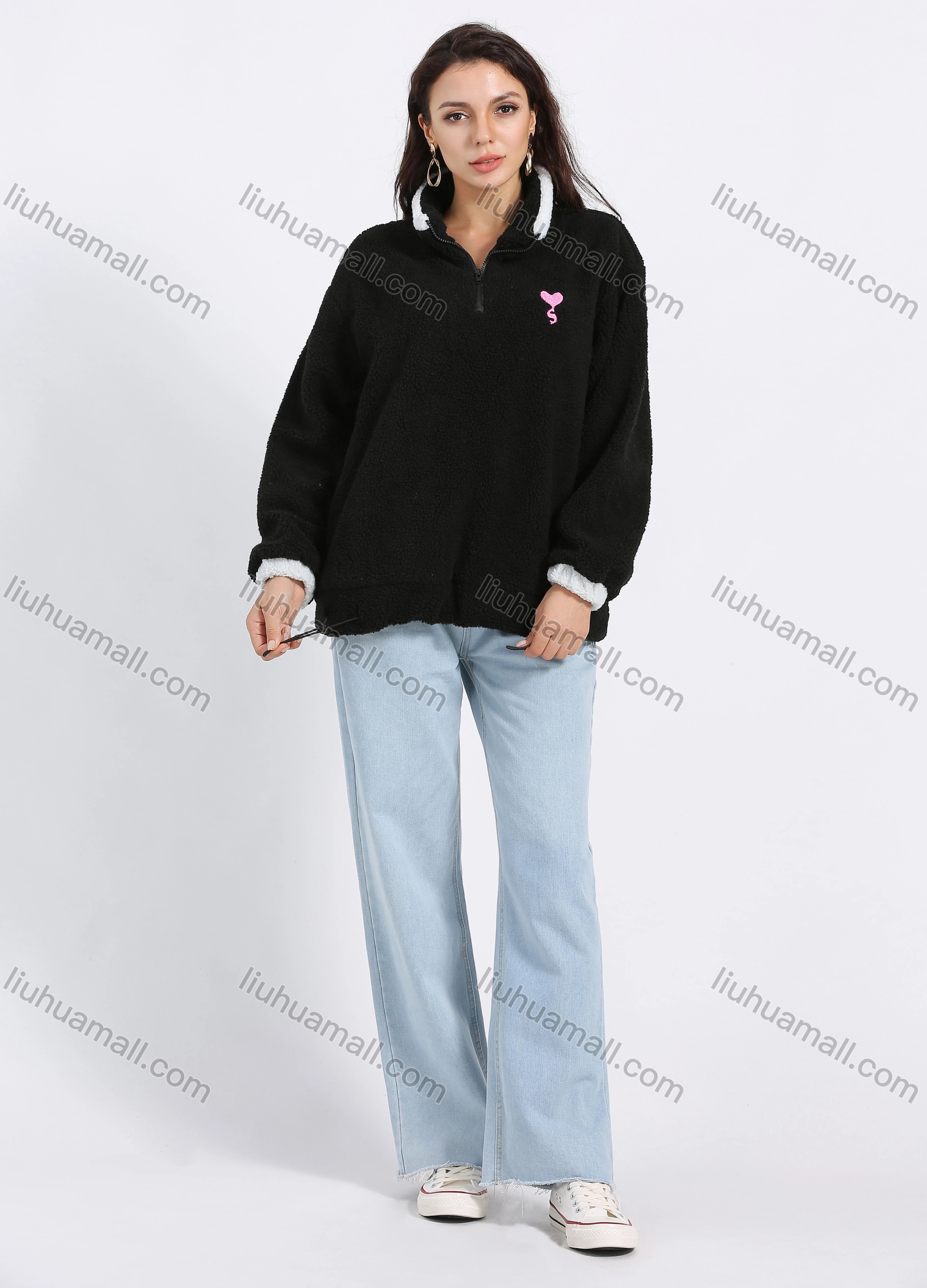 Wholesale Women's Casual Quarter Zip Stand Collar Embroidery Pullover Teddy Coat