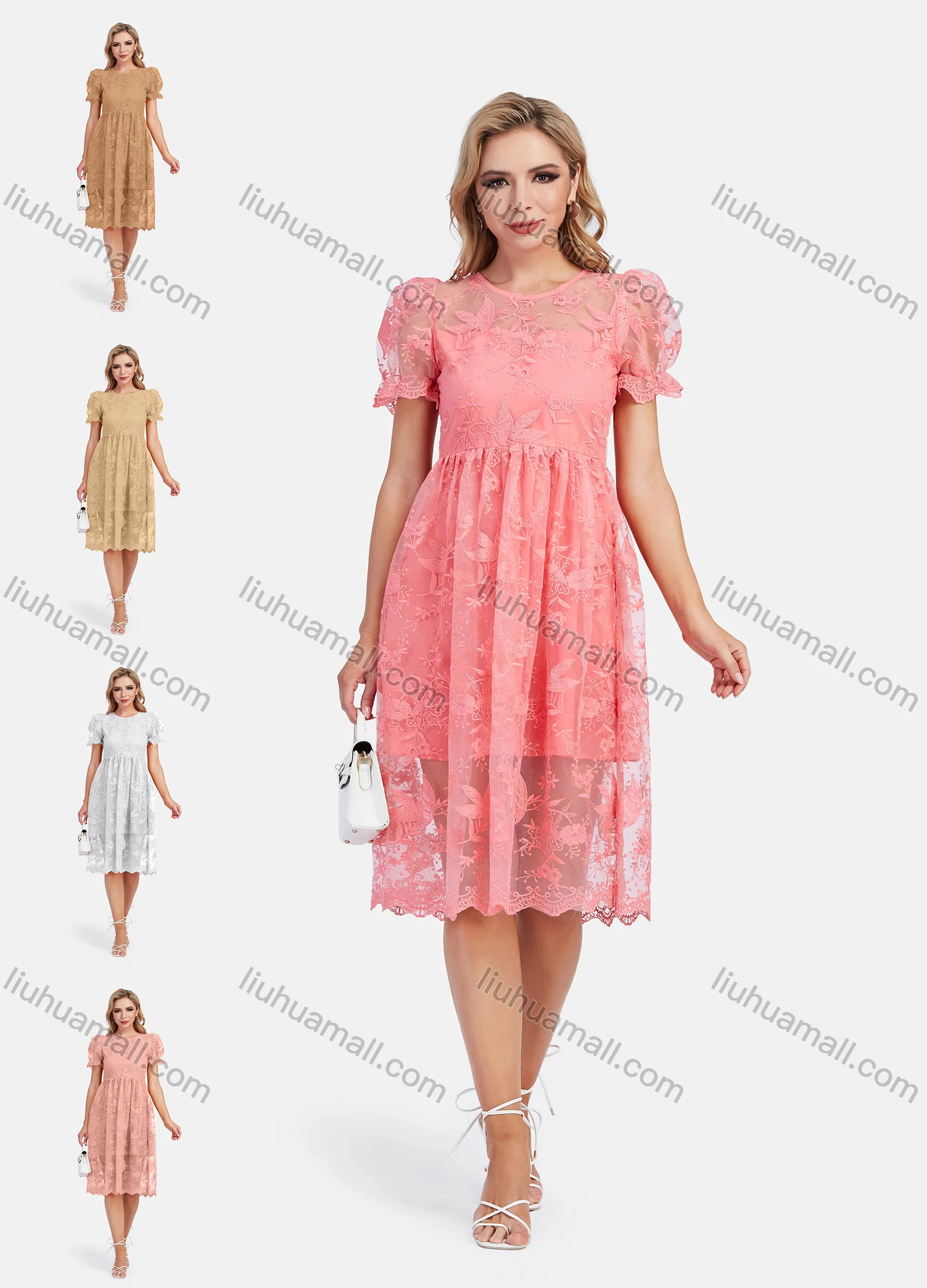Wholesale Women's Casual Round Neck Puff Sleeve Ruffle Hem Embroidery Knee Length Dress