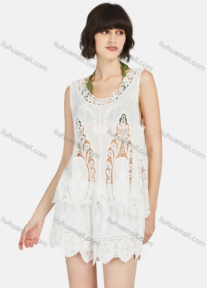 Wholesale Women's Casual Round Neck Sleeveless Hollow Out Plain Cover Up & Shorts Sets