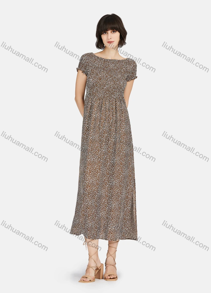 Wholesale Women's Casual Short Sleeve Bateau Neck Allover Print Split Side Midi Dress