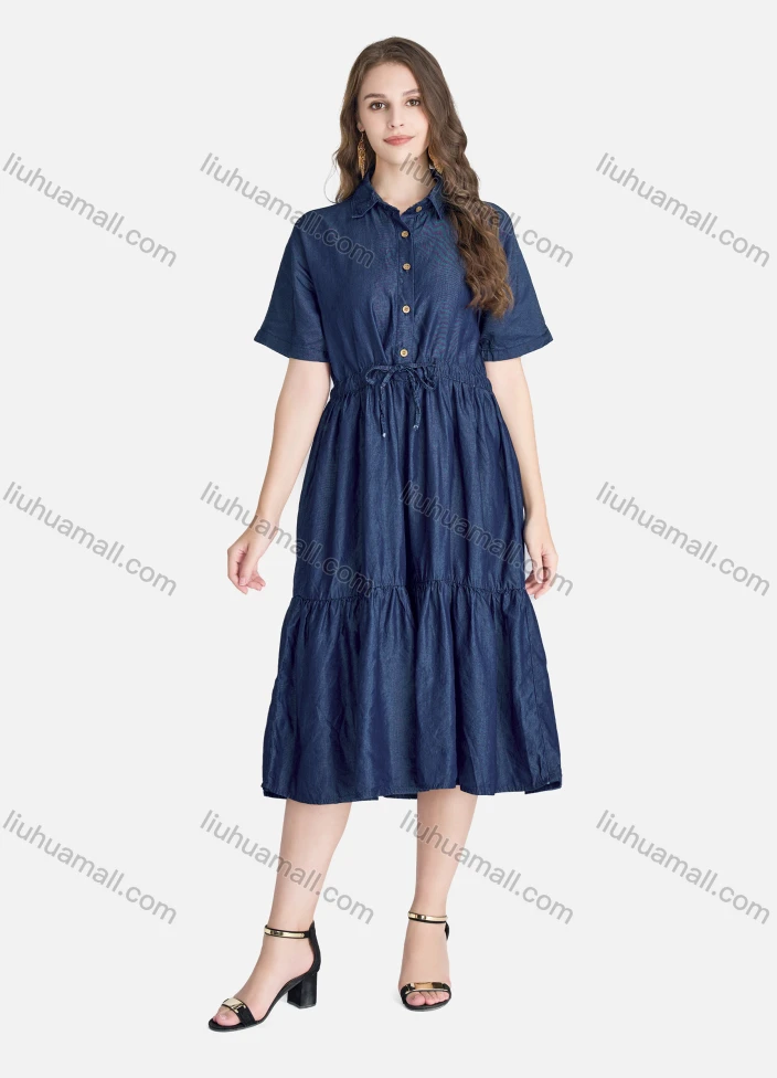 Wholesale Women's Casual Short Sleeve Ruffle Hem Button Front Plain Shirt Dress