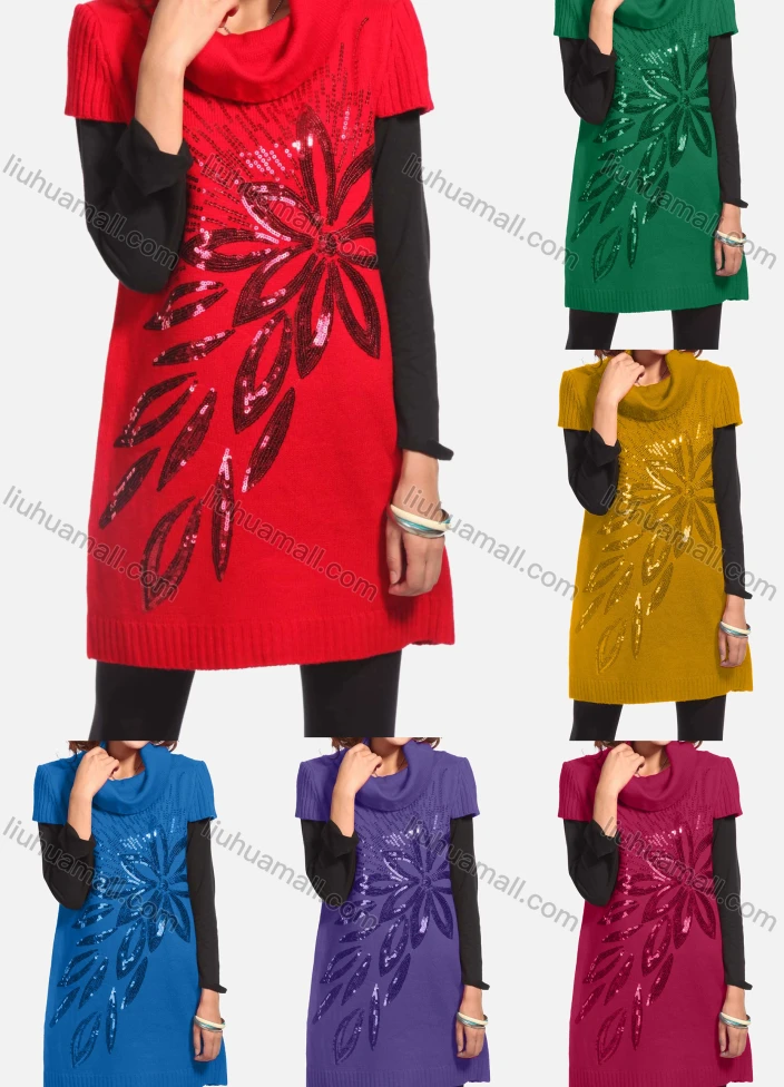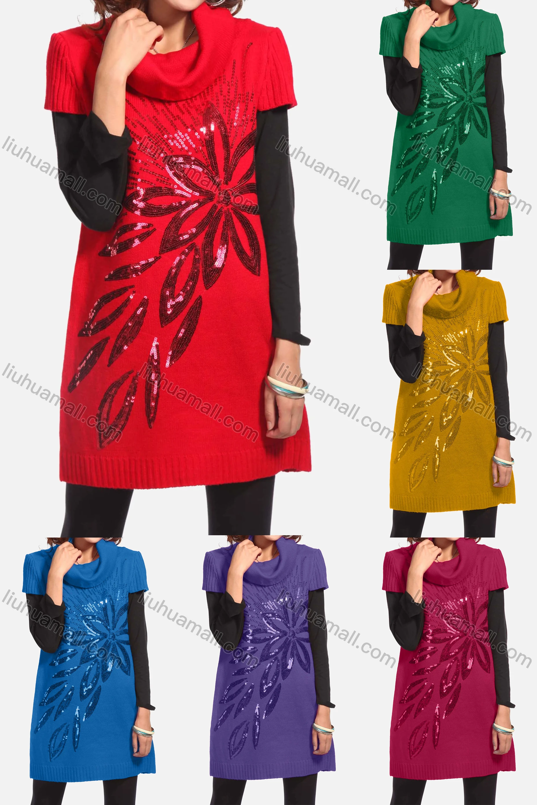 Wholesale Women's Casual Short Sleeve Turtleneck Butterfly Sequin Knit Tunic 350#