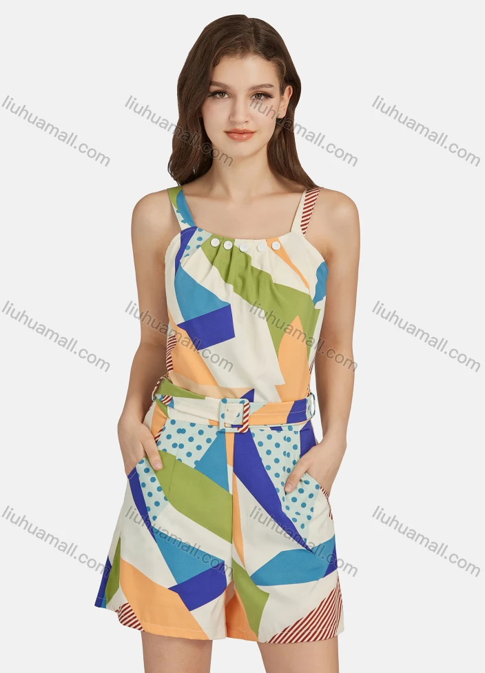 Wholesale Women's Casual Sleeveless Button Decor Allover Print Belted Romper 28018#