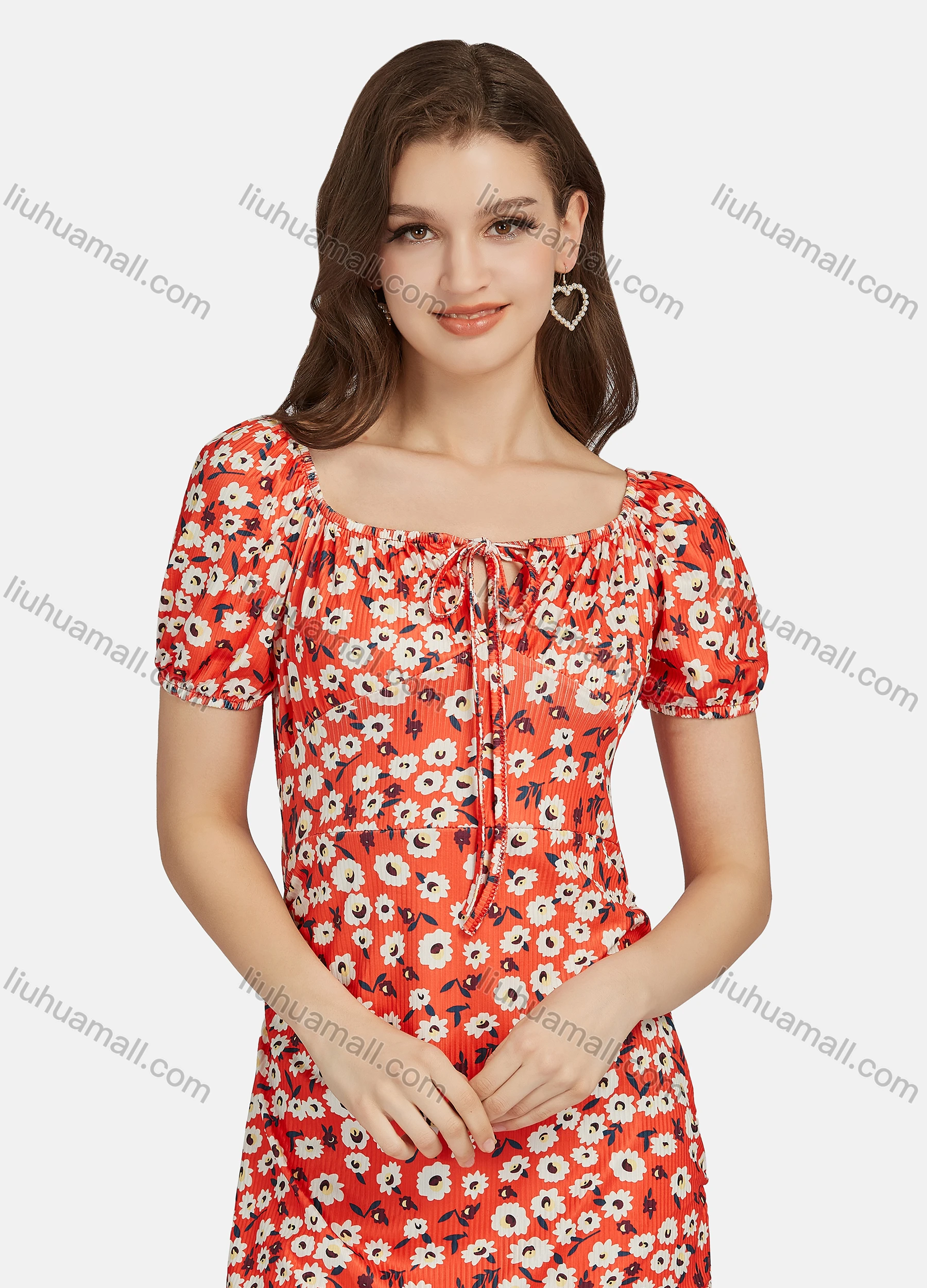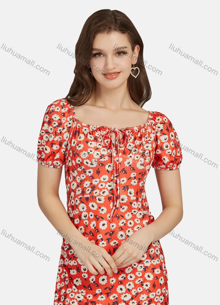 Wholesale Women's Casual Slim Fit Bateau Neck Floral Print Ruffle Hem Midi Dress 28461#
