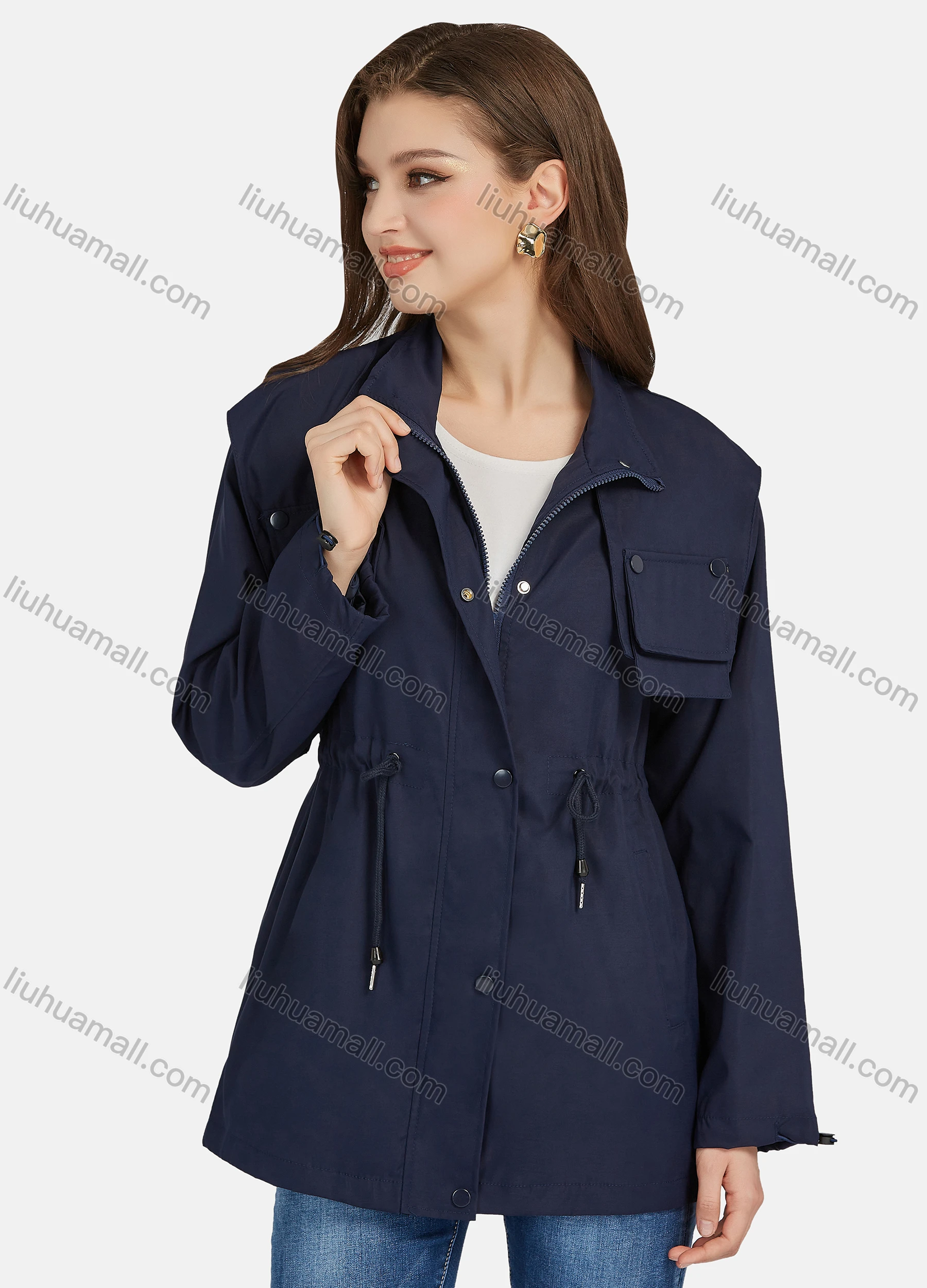Wholesale Women's Casual Snap Buttons Stand Collar Drawstring Windbreaker Jacket M-E22#