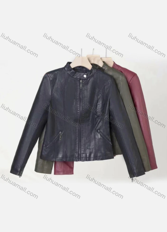 Wholesale Women's Casual Stand Collar Long Sleeve Zipper Plain Leather Crop Biker Jacket