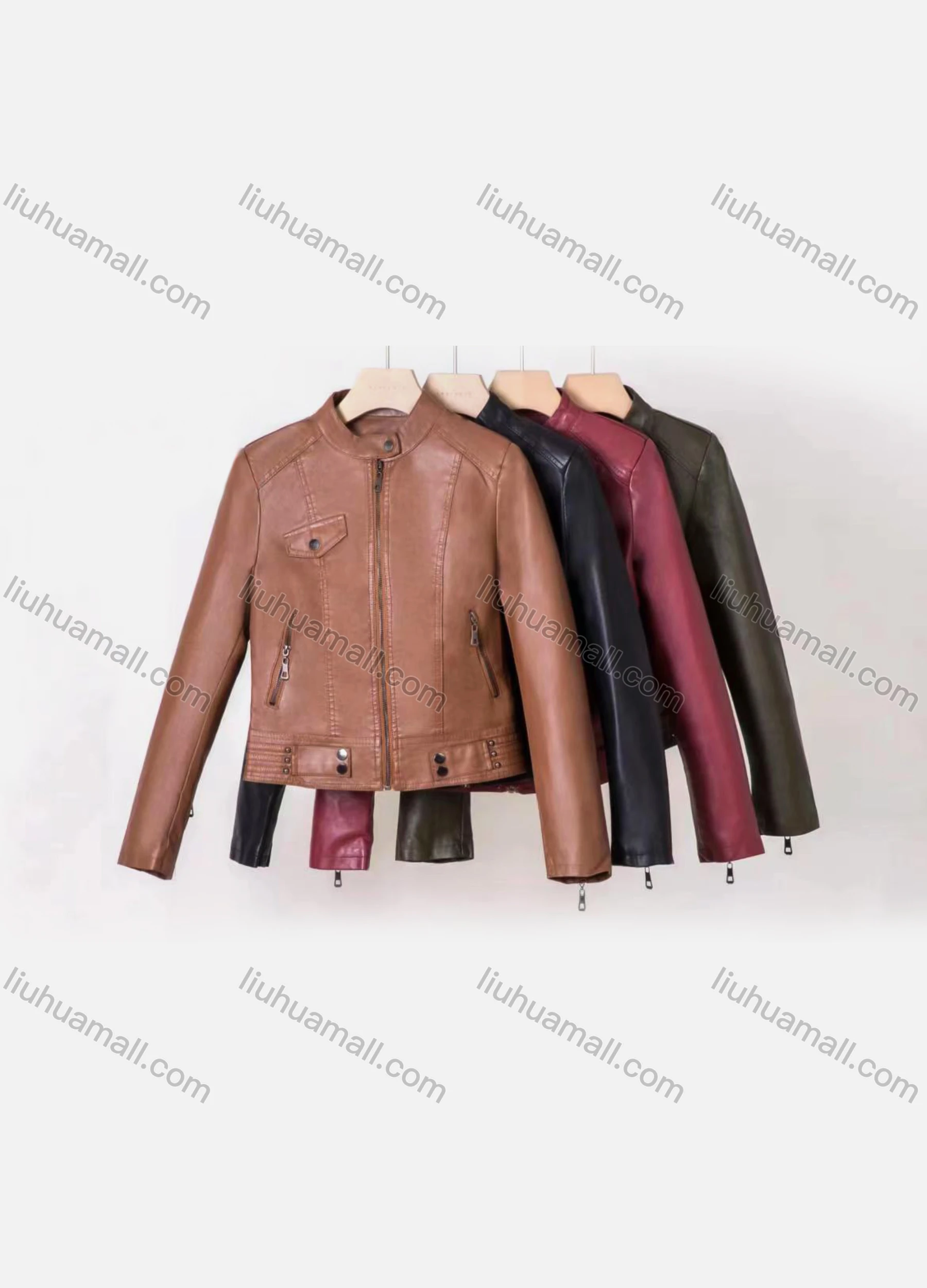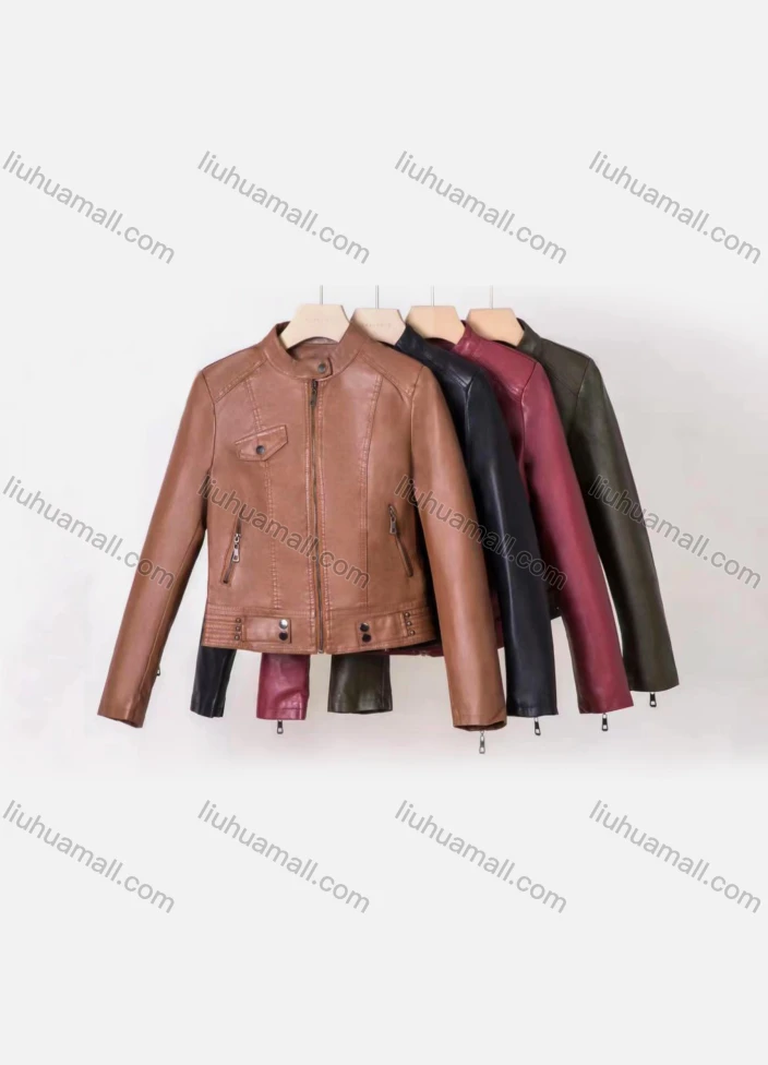 Wholesale Women's Casual Stand Collar Long Sleeve Zipper Plain Leather Crop Biker Jacket - Liuhuamall