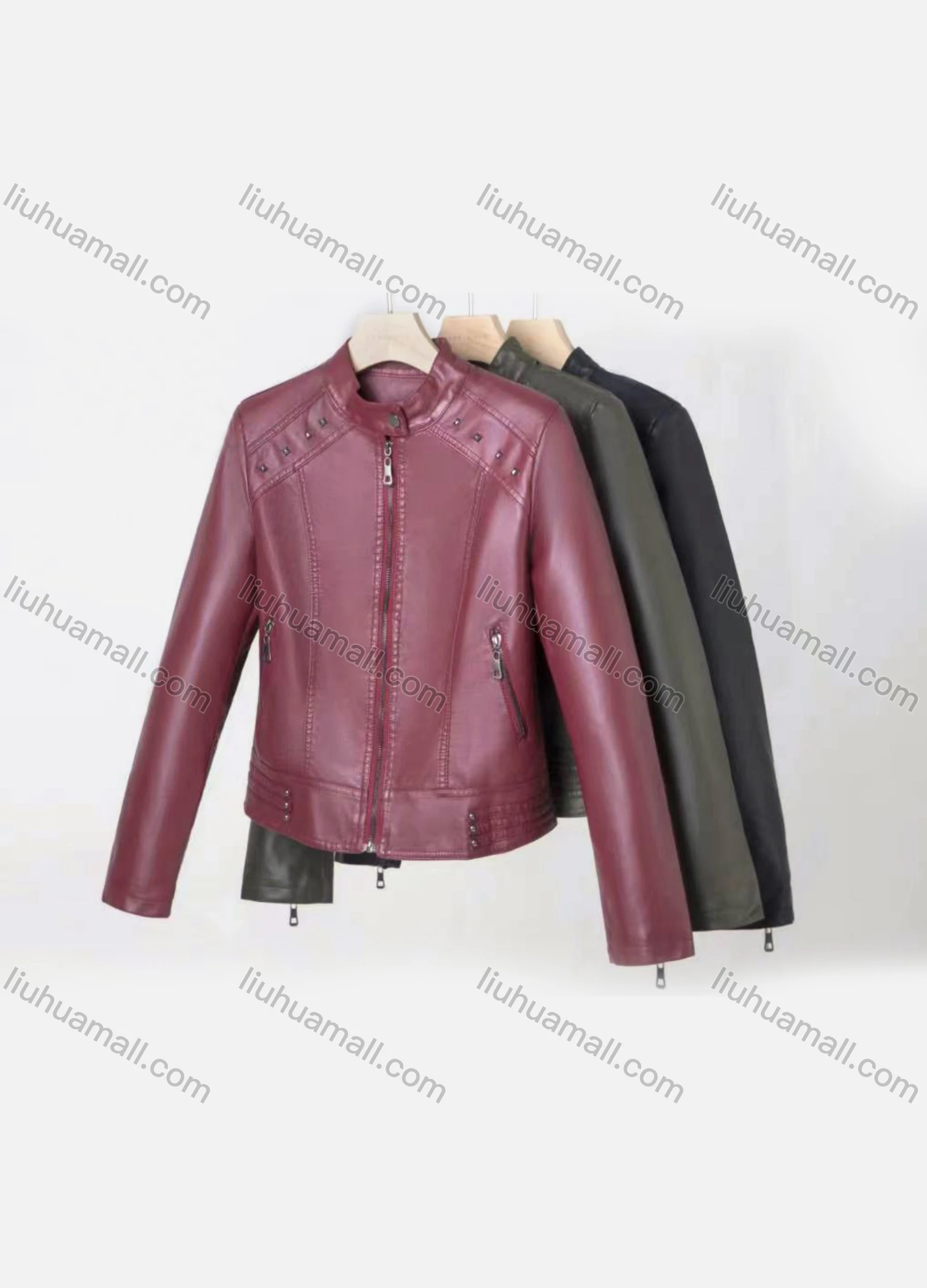 Wholesale Women's Casual Stand Collar Long Sleeve Zipper Plain Leather Crop Biker Jacket - Liuhuamall