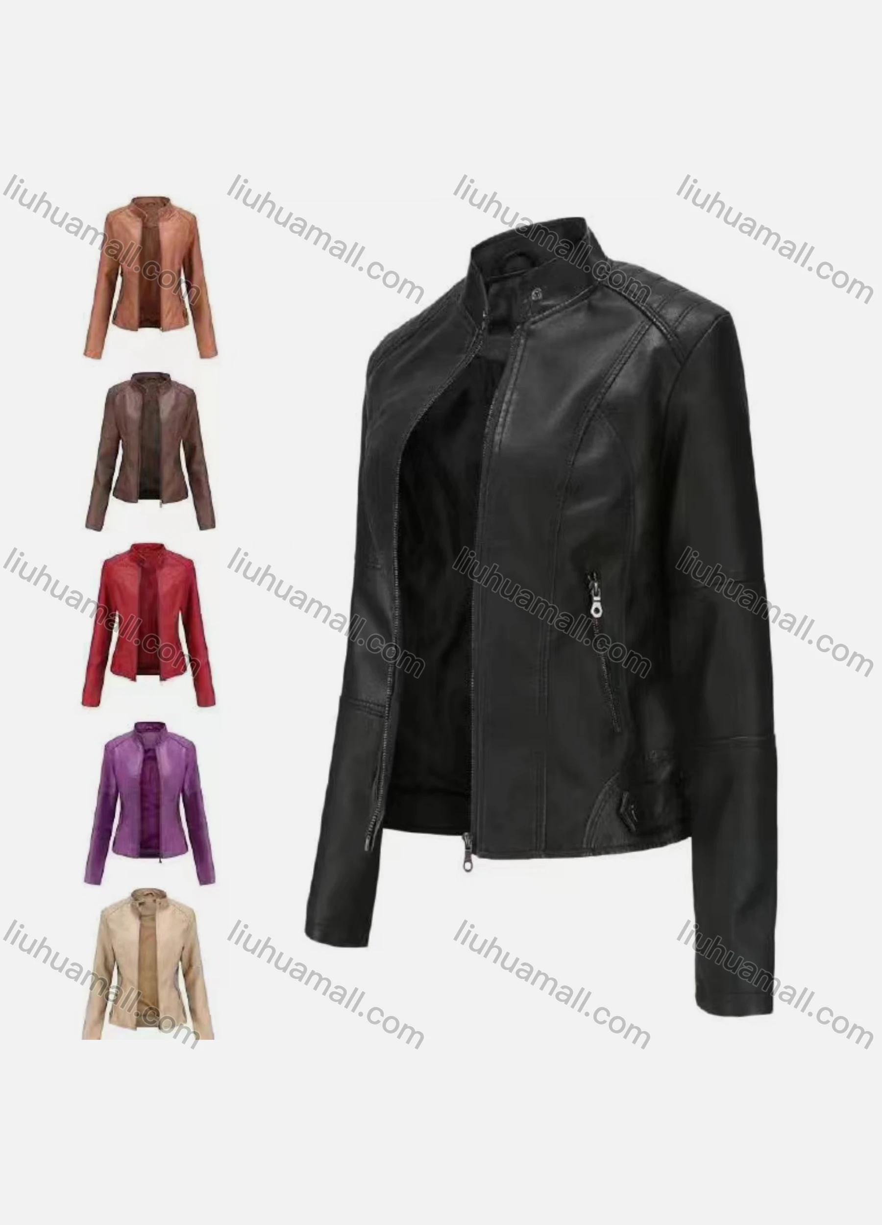Wholesale Women's Casual Stand Collar Long Sleeve Zipper Plain Leather Jacket