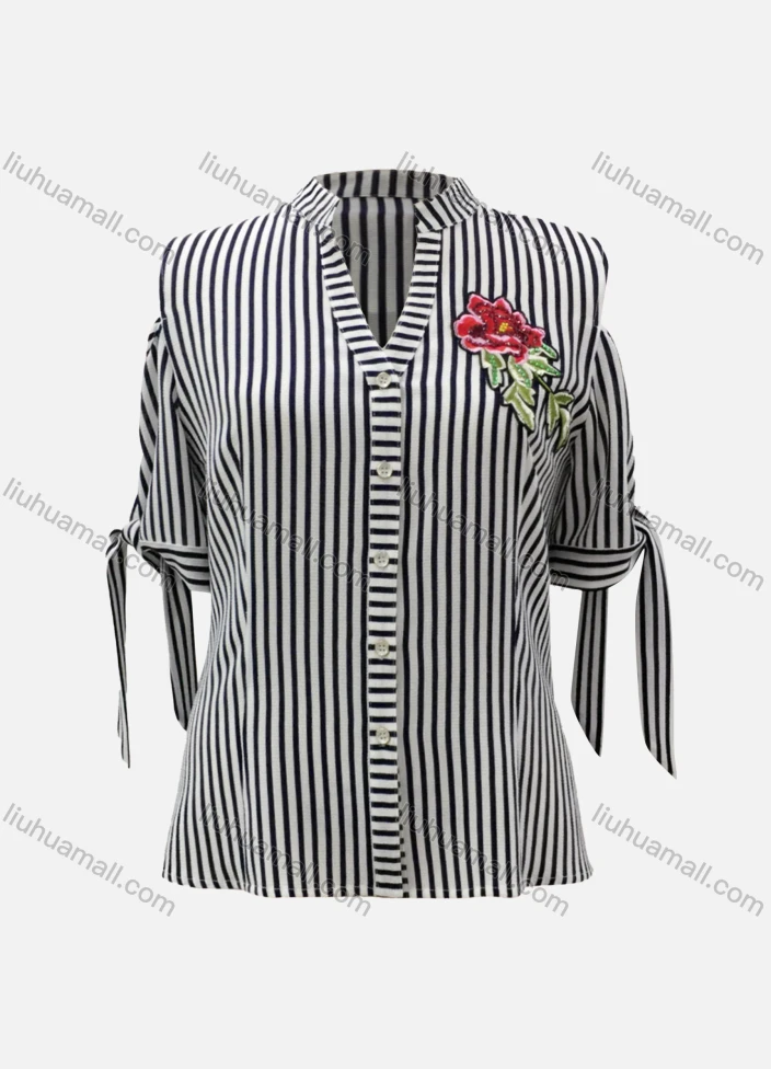 Wholesale Women's Casual Striped Floral Embroidery Notched Neck Rolled Sleeve Lace Up Button Down Blouse
