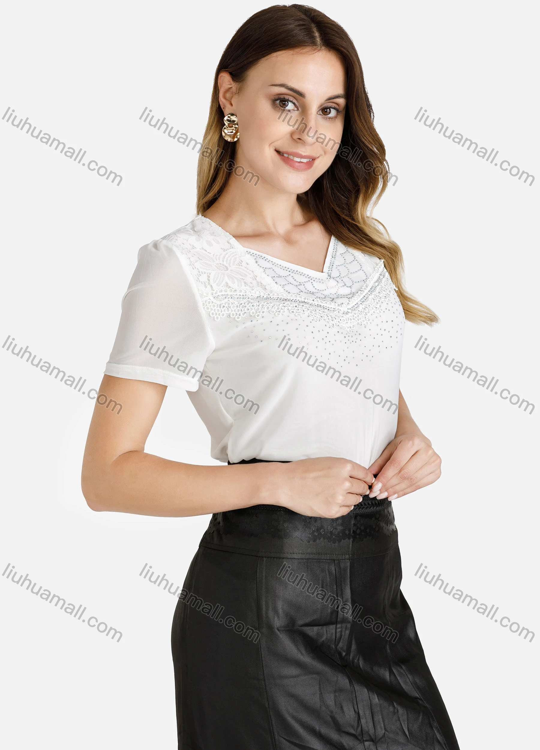 Wholesale Women's Casual Sweetheart Neck Short Sleeve Lace Applique Rhinestone Tops