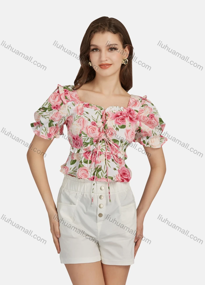 Wholesale Women's Casual Sweetheart Tie Front Poet Sleeve Floral Crop Top 28496#