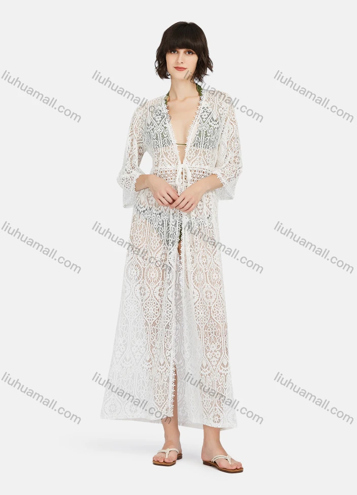 Wholesale Women's Casual Tie Front Hollow Out Plain Lace Long Cardigan