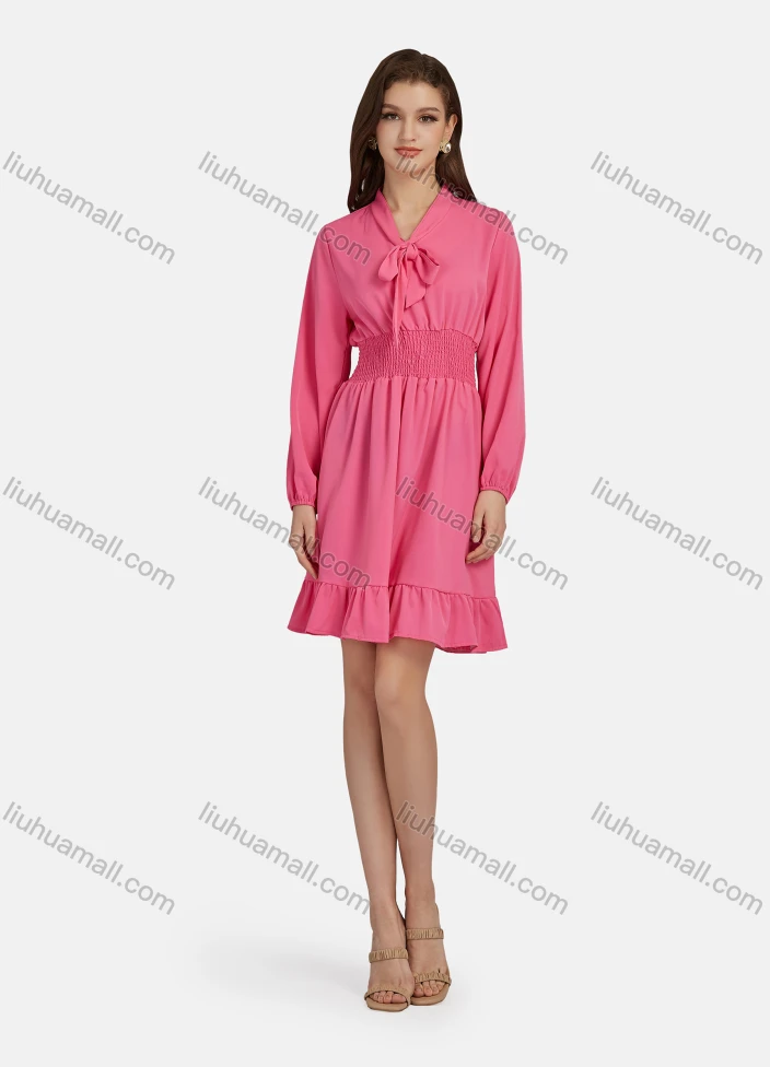 Wholesale Women's Casual Tie Neck Shirred Peplum Plain Ruffle Hem Dress 10056#
