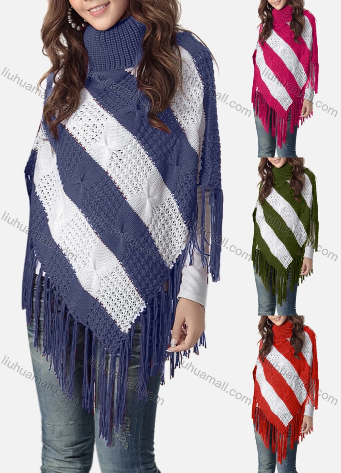 Wholesale Women's Casual Turtleneck Half Sleeve Scarf Hem Striped Knit Cape 2981#
