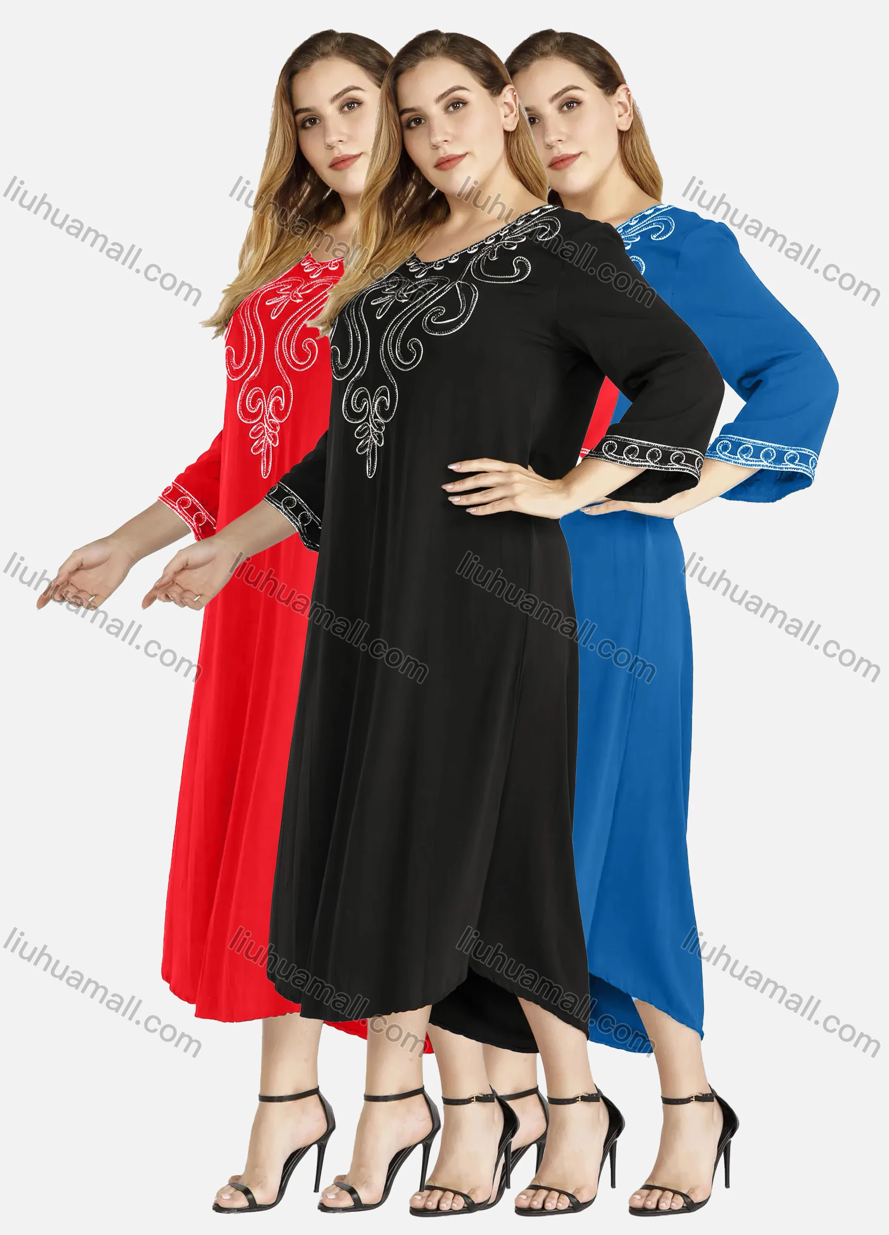 Wholesale Women's Casual V Neck 3/4 Sleeve Embroidered Midi Dress