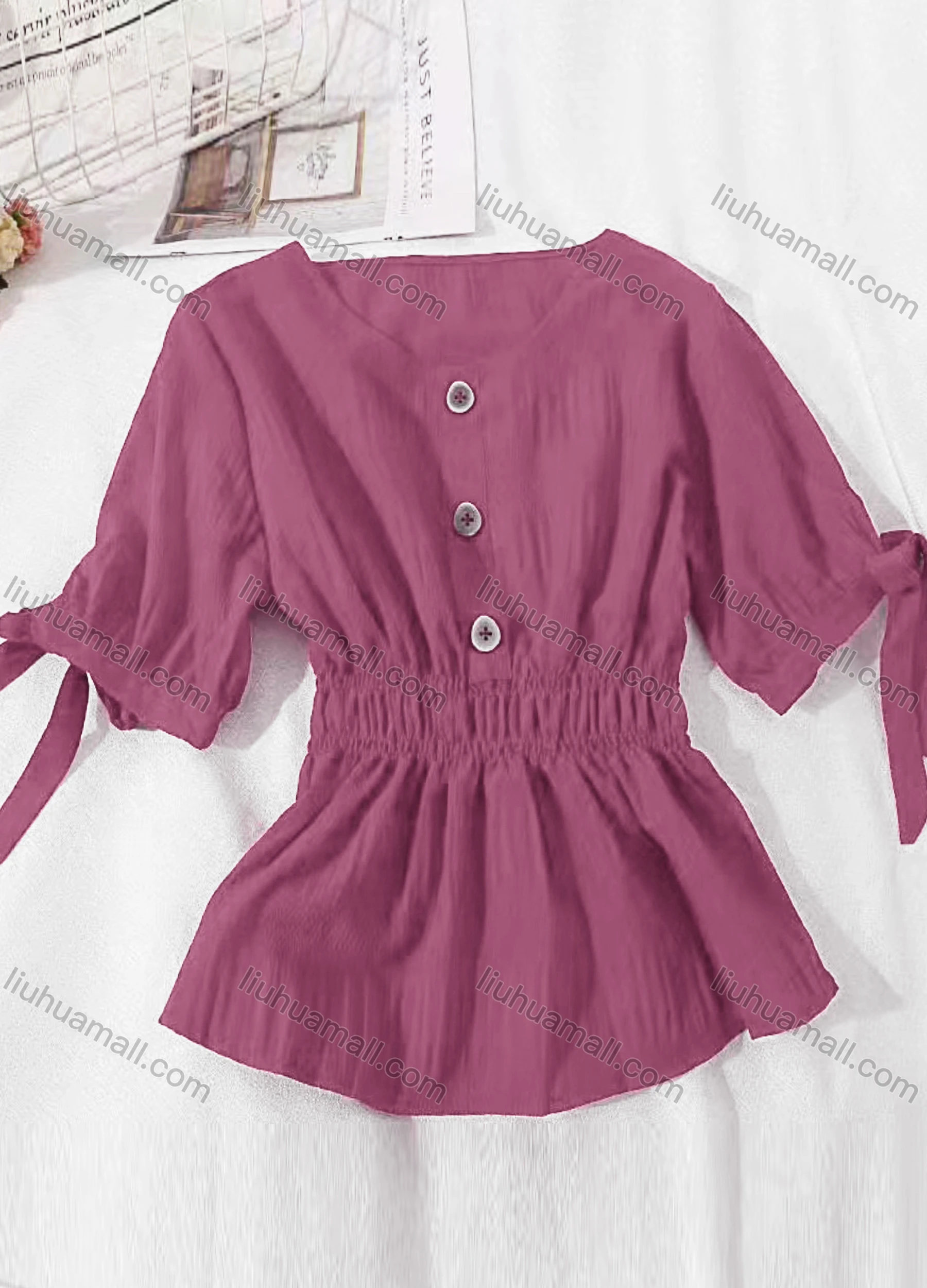 Wholesale Women's Casual V Neck Button Decor Shirred Plain Blouse