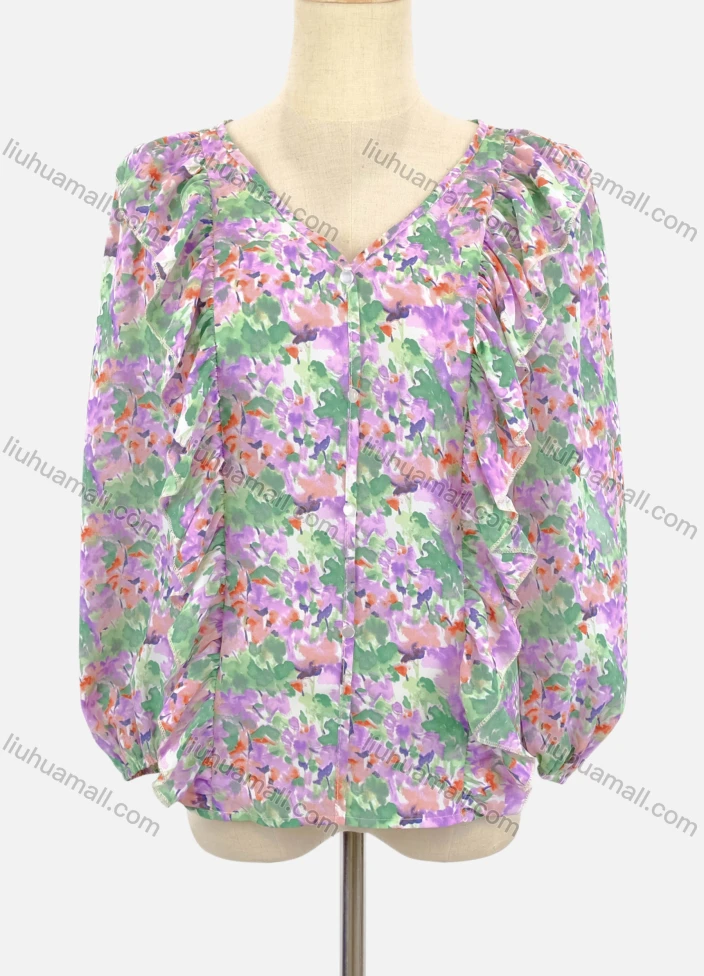 Wholesale Women's Casual V Neck Long Sleeve Button Front Ruffle Trim Ruched Floral Print Blouse