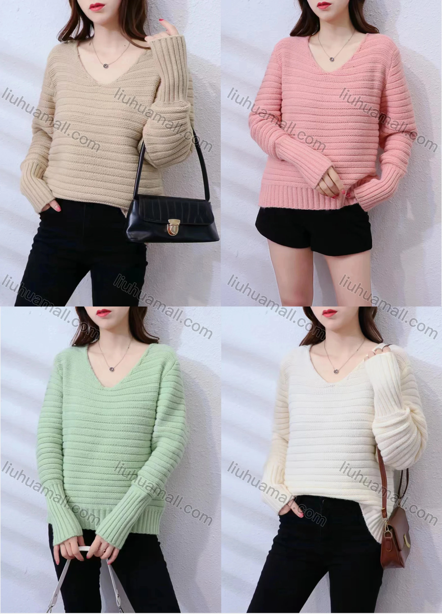 Wholesale Women's Casual V Neck Plain Rib-knit Sweater
