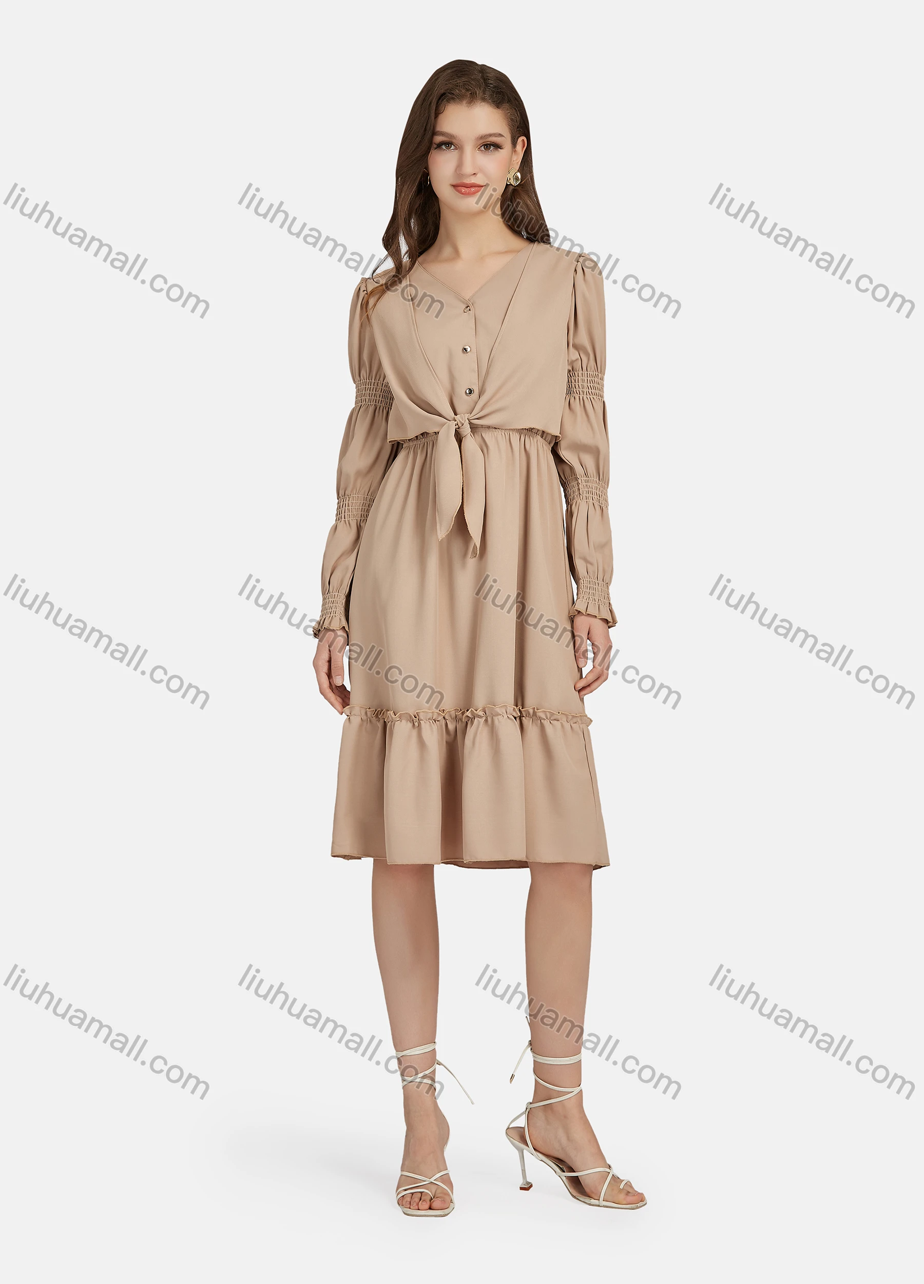 Wholesale Women's Casual V Neck Tie Front Button Front Ruffle Hem Dress 10097#