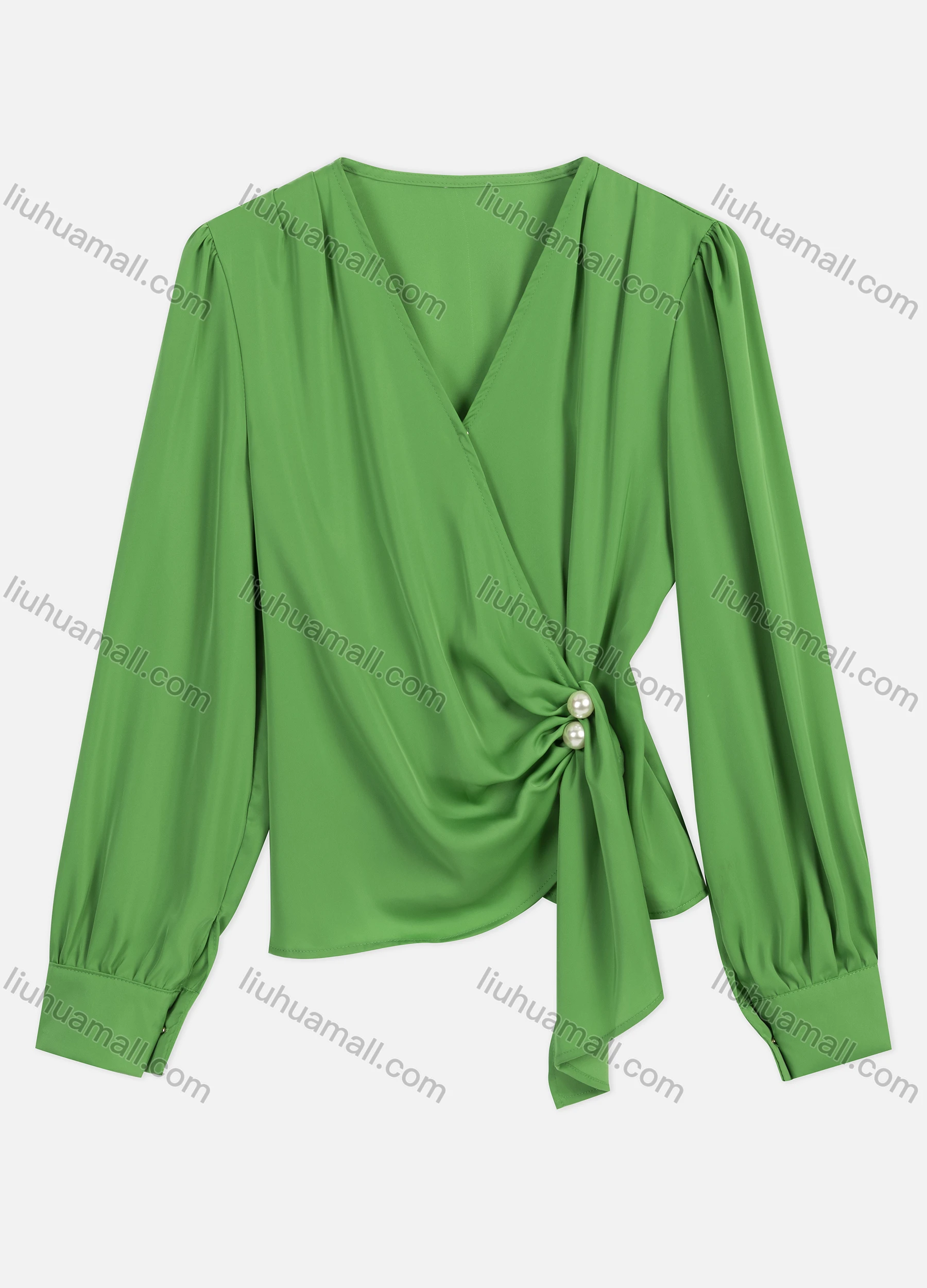 Wholesale Women's Casual V Neck Twist Eellished With Pearls Long Sleeve Plain Pearl Decor Blouse 8951#