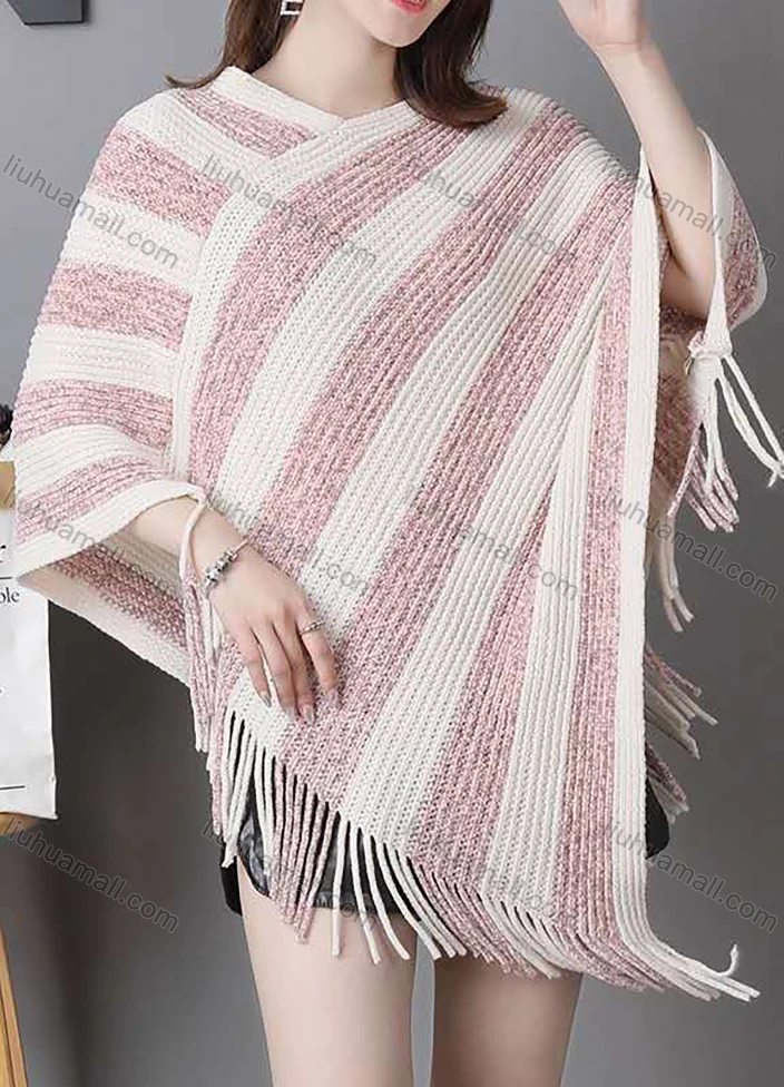 Wholesale Women's Casual Wrap Batwing Sleeve Fringe Trim Striped Cape