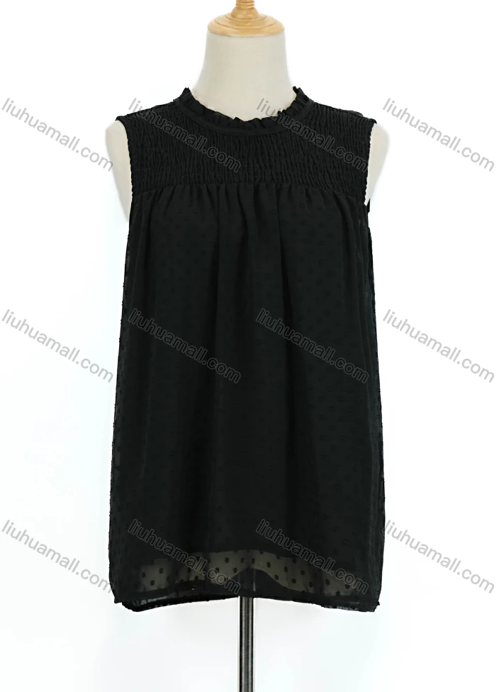 Wholesale Women's Causal Round Neck Sleeveless Swiss Dot Plain Ruffle Trim Shirred Ruched Blouse