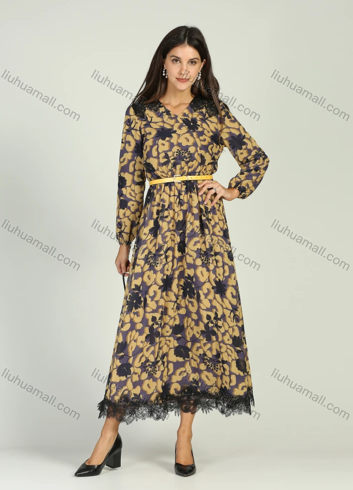 Wholesale Women's Chiffon Long Sleeve Floral Print V-Neck Lace Trim Wrap Maxi Dress With Belt