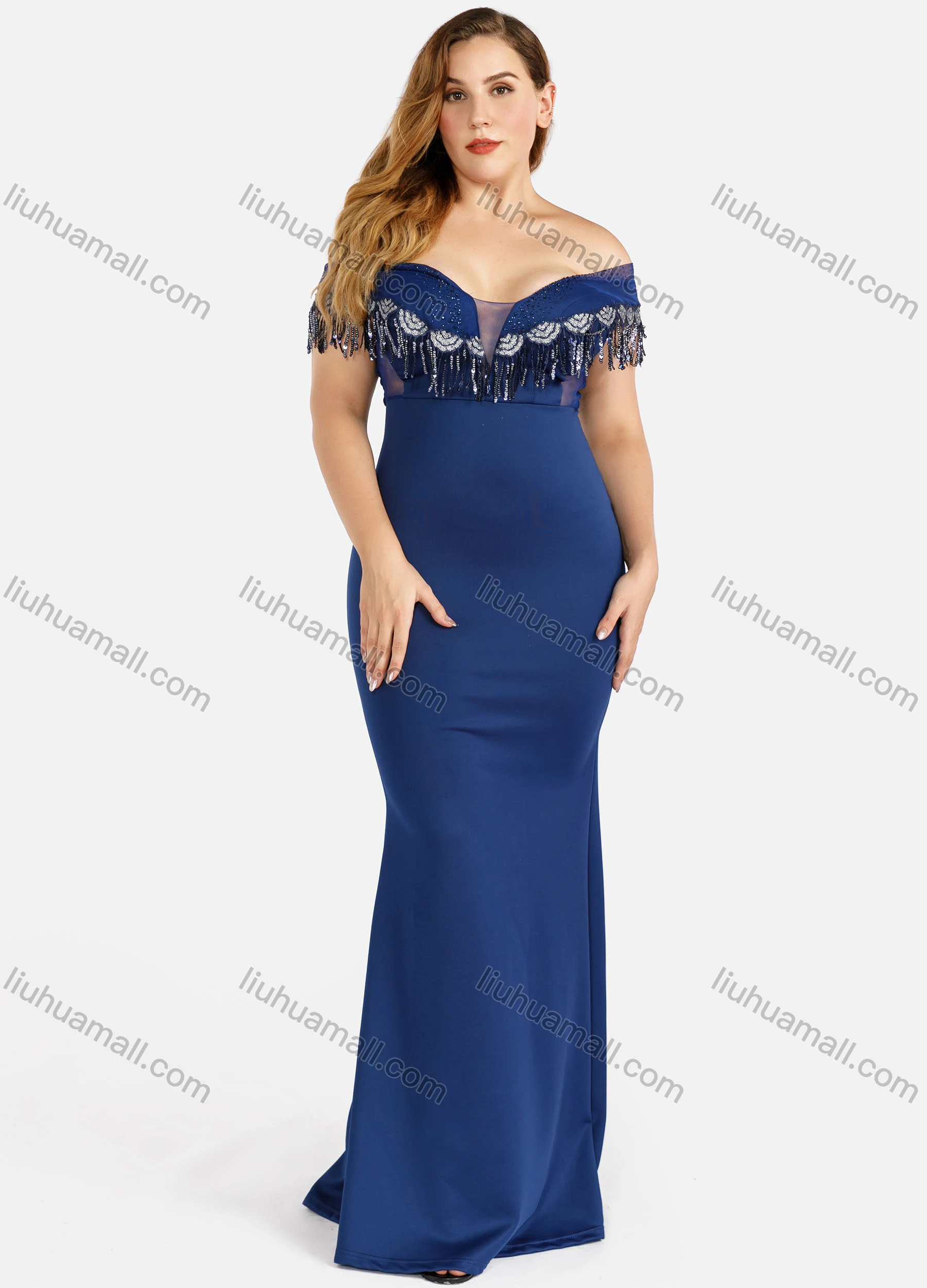 Wholesale Women's Elegant Off Shoulder Splicing Mesh Zip Back Rhinestone Sequin Fringe Glitter Mermaid Evening Dress