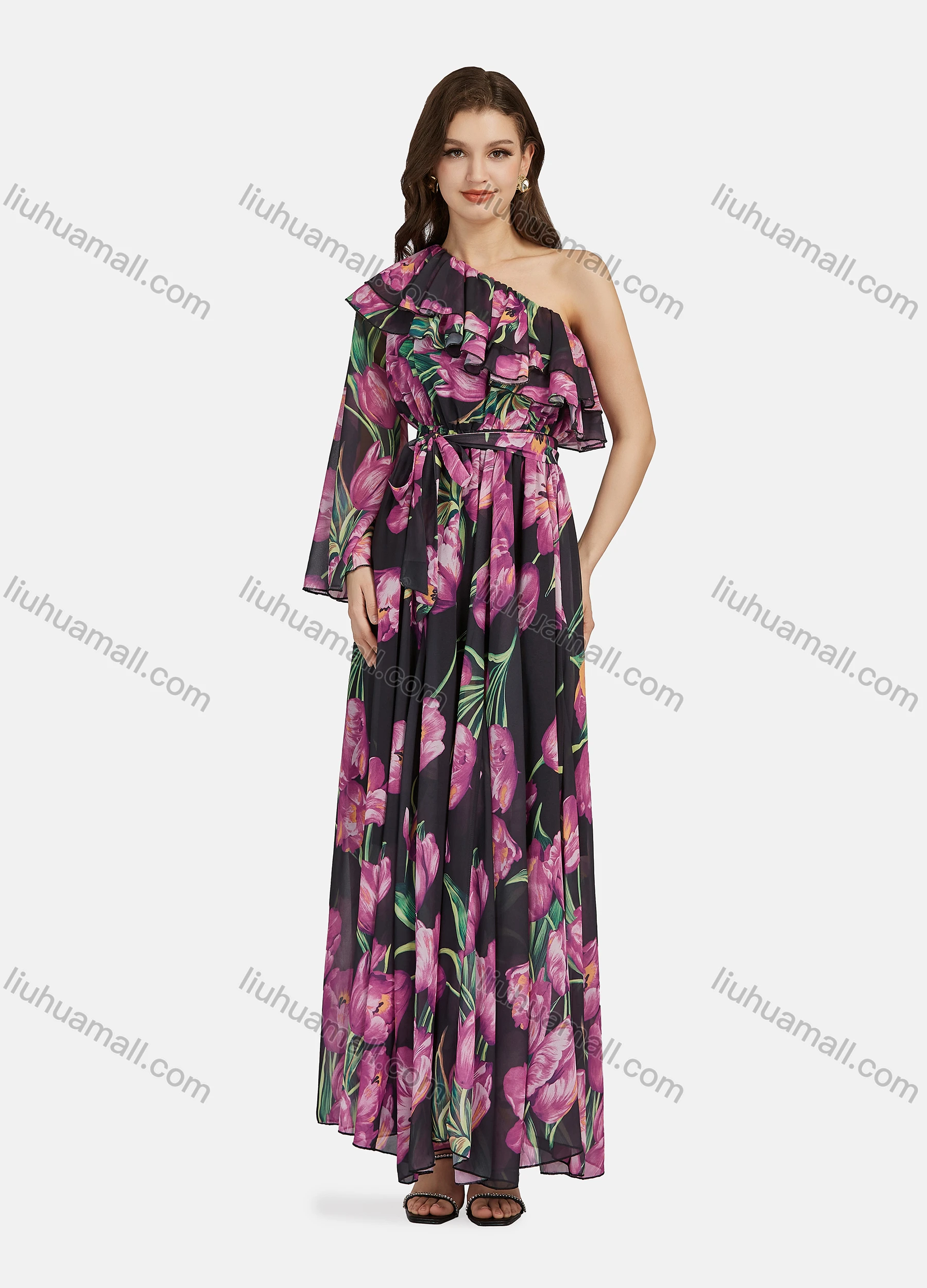 Wholesale Women's Elegant One Shoulder Floral Lace Up Ruffle Trim Chiffon Maxi Dress