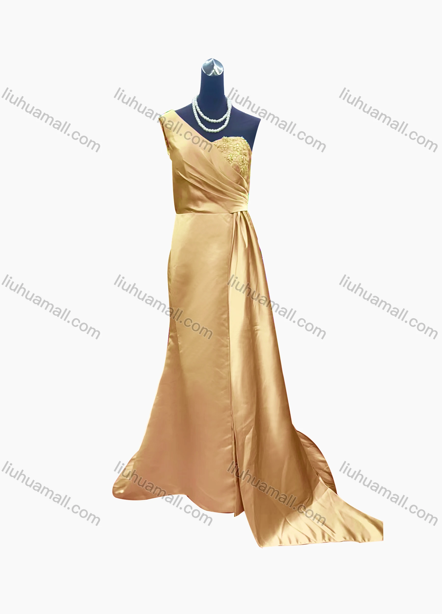 Wholesale Women's Elegant Plain One Shoulder Ruched Split Hem Beaded Applique Floor Length Evening Dress