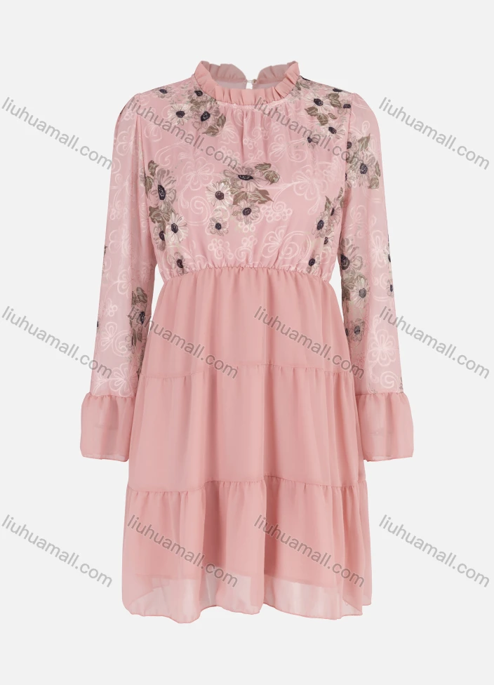 Wholesale Women's Elegant Ruffle Neck Long Sleeve Floral Print Chiffon Short Dress
