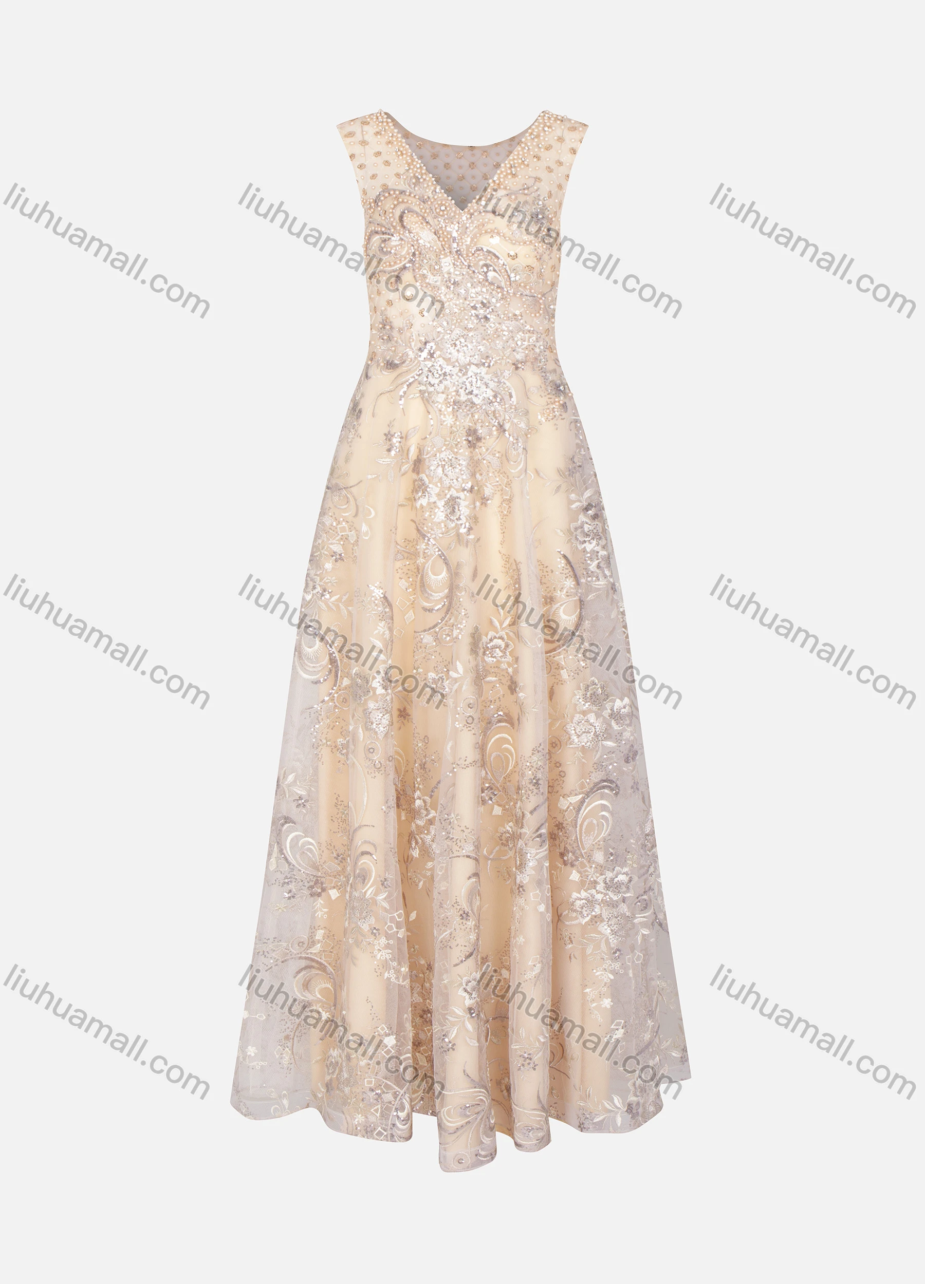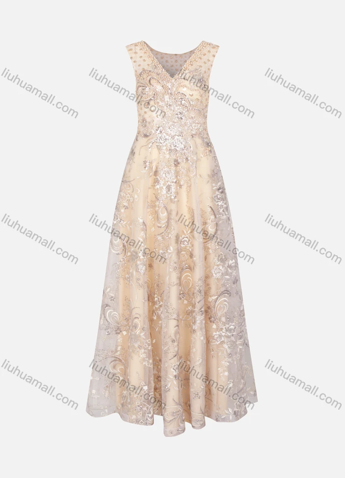 Wholesale Women's Elegant Sleeveless V Neck Sequin Rhinestone Pearl Appliques Evening Dress