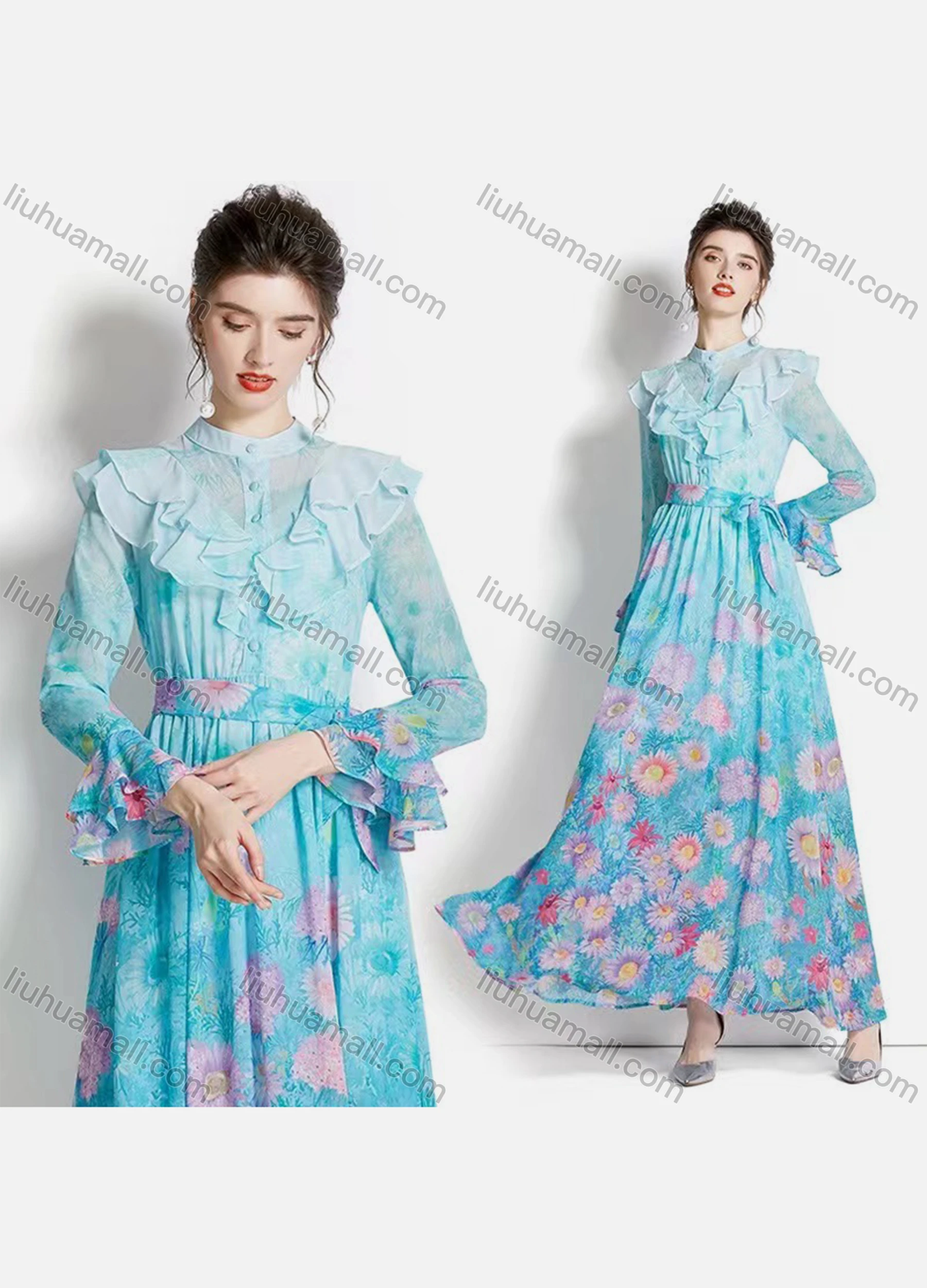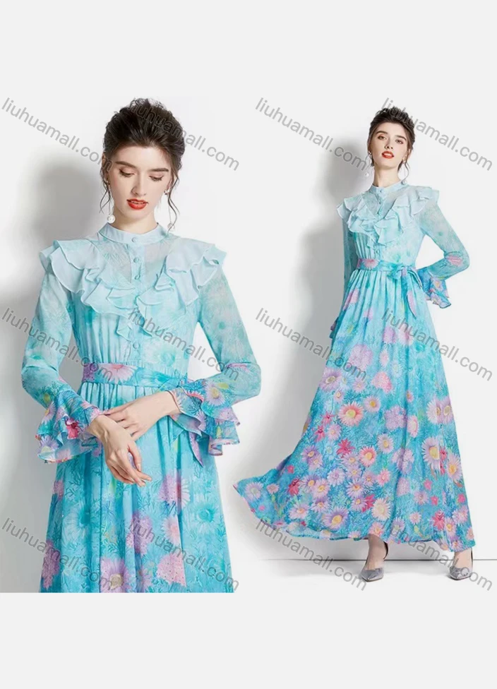 Wholesale Women's Elegant Stand Collar Ruffle Cuff Floral Maxi A-line Dress 3652#